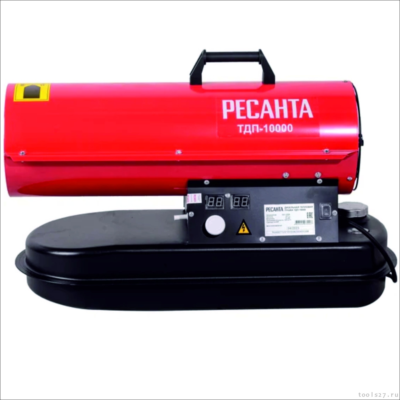 Ресанта ТДП-10000 относится к приборам с прямым типом нагрева. Промышленный вентилятор с производительностью 320 м³/час прогоняет воздух сквозь пламя горелки. Температура выходящего воздуха достигает 800 градусов. Продукты горения отводятся вместе с воздухом. Поэтому дизельные тепловые пушки рекомендовано использовать в нежилых помещениях с качественной вентиляцией.