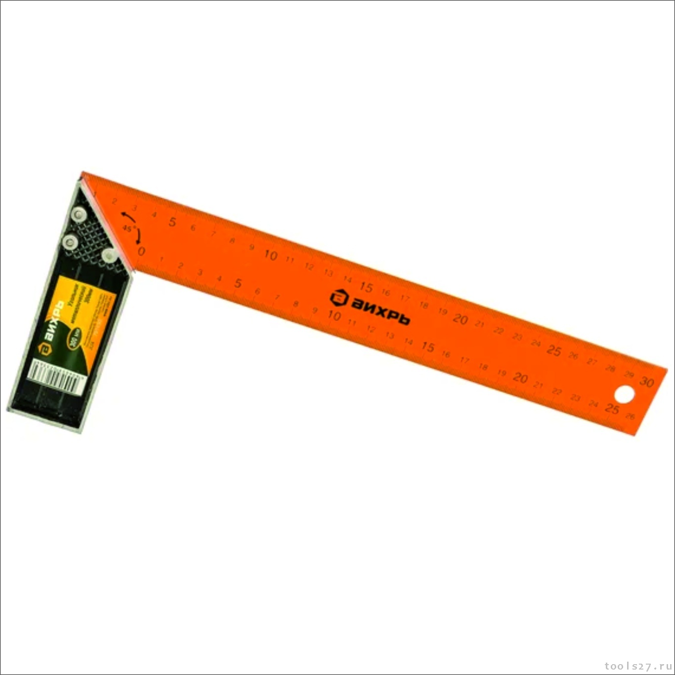 Угольник металлический ВИХРЬ 300 мм используется для измерения расстояния и определения углов 45° и 90°. Он состоит из двух элементов, которые соединены под прямым углом. Его наружная длина 30 см и внутренняя - 26 см. Металлическое основание окрашено для защиты от коррозии.