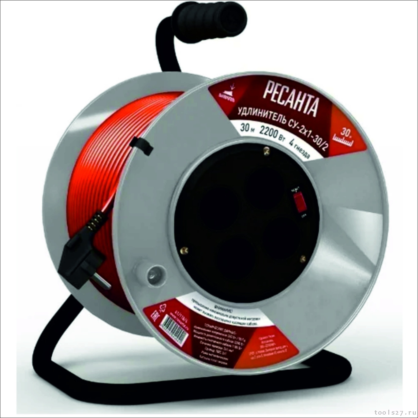 Удлинитель силовой Ресанта на катушке, СУ-2x1-30/2 (с выключателем, 4 розетки) 61/118/4
