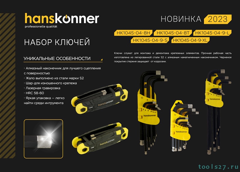 Набор шестигранных ключей с шаром, 1, 5-10 мм, 9 шт, S2, экстра-длинные, Hanskonner: HK1045-04-9-XL (1018)