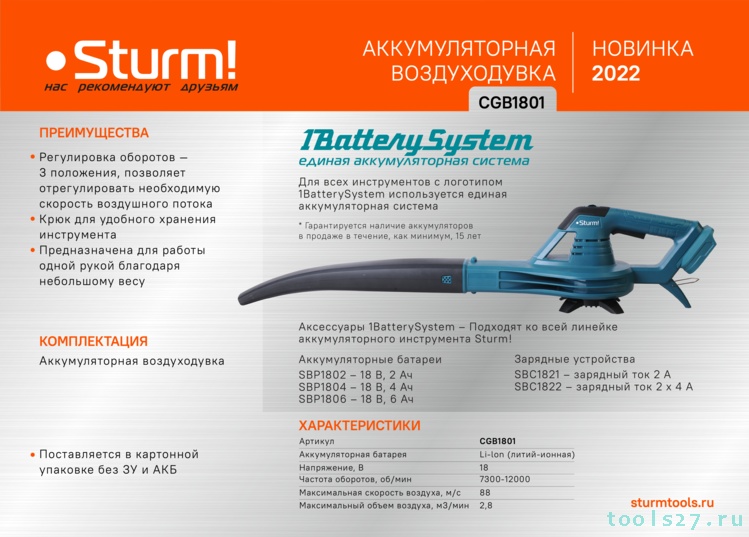 -1BatterySystem - универсальная аккумуляторная система. Подходит ко всей линейке аккумуляторного инструмента Sturm! Сменные батареи будут в продаже в течение 15 лет