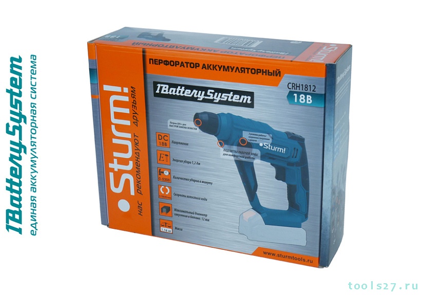 Аккумуляторный перфоратор является частью системы 1BatterySystem. 1BatterySystem - универсальная аккумуляторная система. Подходит ко всей линейке аккумуляторного инструмента Sturm!