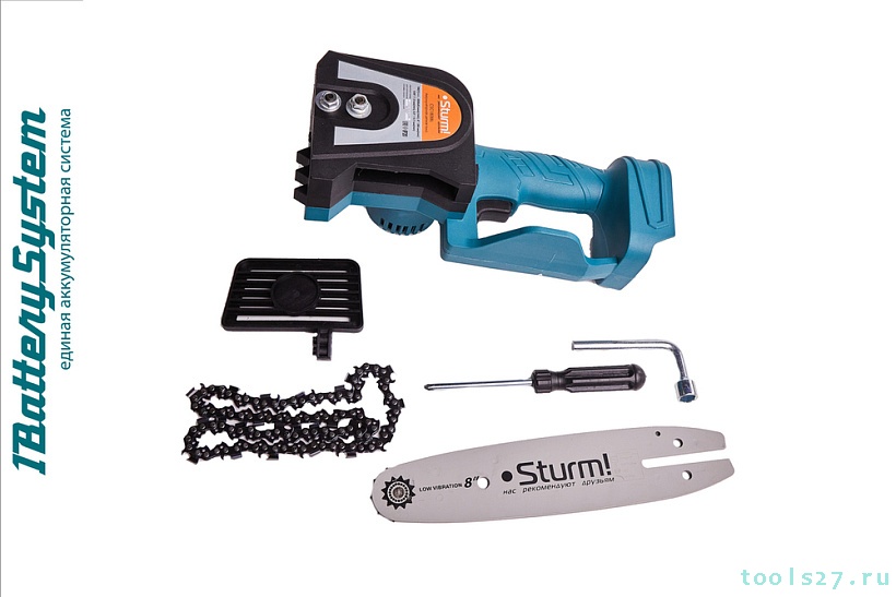 Аккумуляторная цепная пила является частью системы 1BatterySystem. 1BatterySystem - универсальная аккумуляторная система. Подходит ко всей линейке аккумуляторного инструмента Sturm!