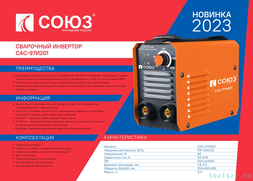 Сварочный инвертор СОЮЗ САС-97И201 — компактный производительный аппарат с простым управлением и универсальным подключением.