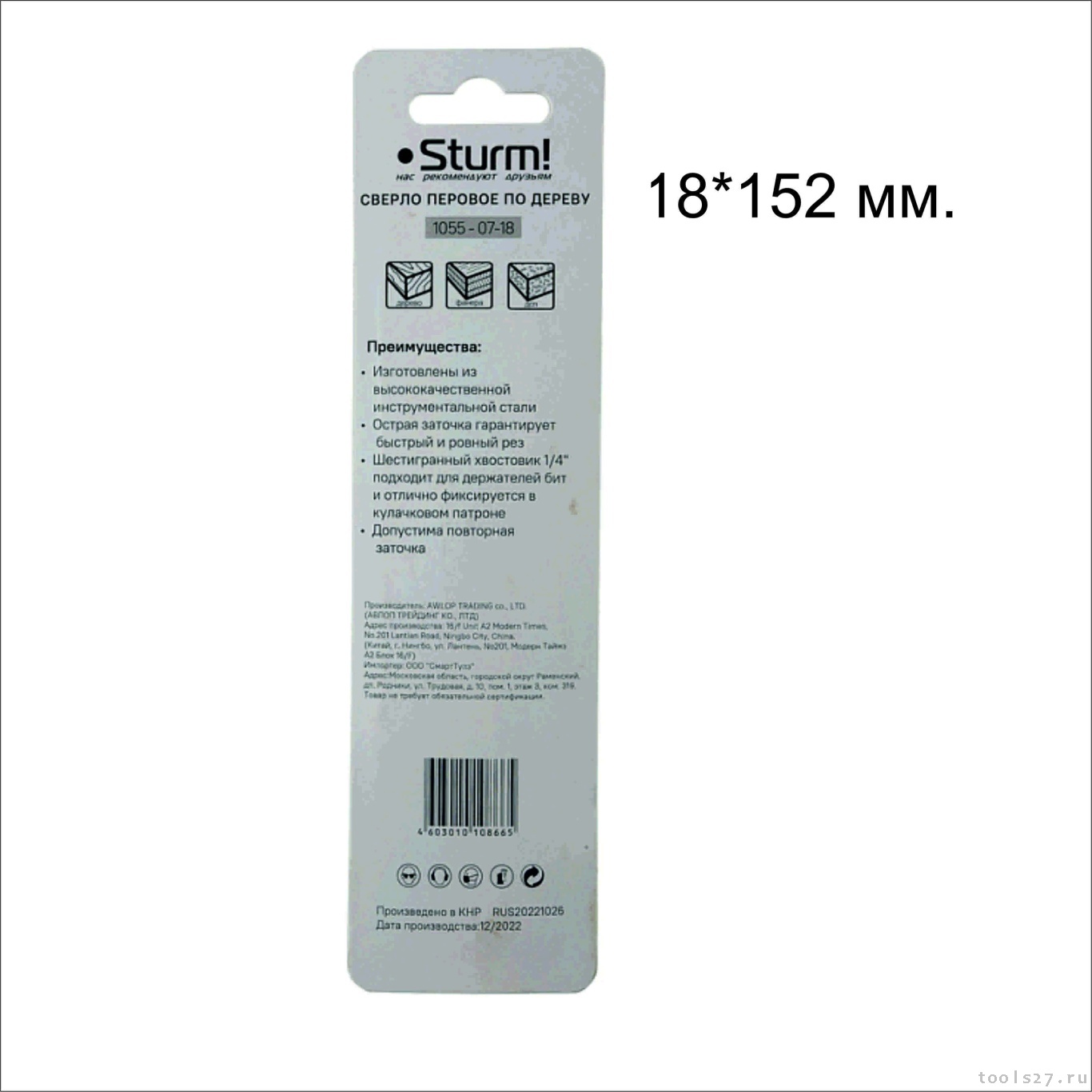 Сверло перовое по дереву, 18мм, шестигранный хвостовик, Sturm! (1082)