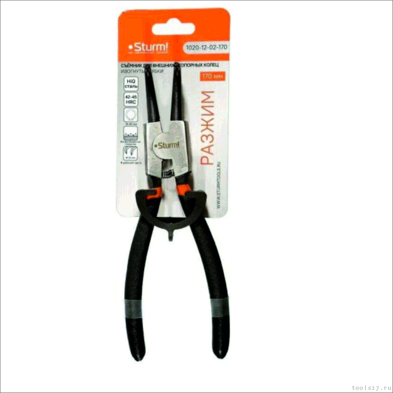 Съёмник стопорных колец 170мм STURM 1020-12-01-170 - ручной инструмент с изогнутыми губками для быстрого и аккуратного снятия/установки стопорных колец. Изделие оснащено удобными, нескользящими накладками на рукоятках.