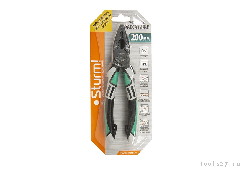 Пассатижи, 200мм, эксцентр. шарнир, CrV сталь, TPE рукоятки, тефлон, Sturm! 1020-13-1-200 (1187)