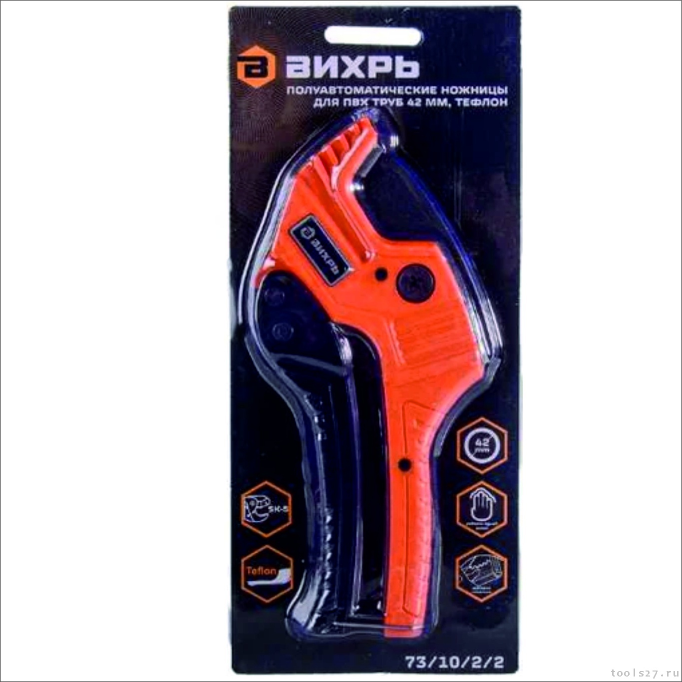 Полуавтоматические ножницы для резки труб Вихрь применяются для разрезания различного типа пластиковых труб при монтаже водопроводных и отопительных систем диаметром до 42 мм, пластиковых плинтусов, профилей и других изделий из пластика, а так же резиновых шлангов. Ножницы изготовлены из высокопрочной японской стали марки SK-5, которая выдерживает самые высокие нагрузки. Тефлоновое покрытие обладает прекрасной адгезией, высокими антикоррозионными свойствами и длительным сроком службы. Оснащены широким основанием под резцом. Это обеспечивает рез под углом 90 градусов и повышает качество резки. Автоматический возврат лезвия отжатием нижней рукоятки для удобной работы одной рукой. Прочный и легкий корпус из алюминиевого сплава и удобные противоскользящие рукоятки обеспечат надежность и комфорт в работе