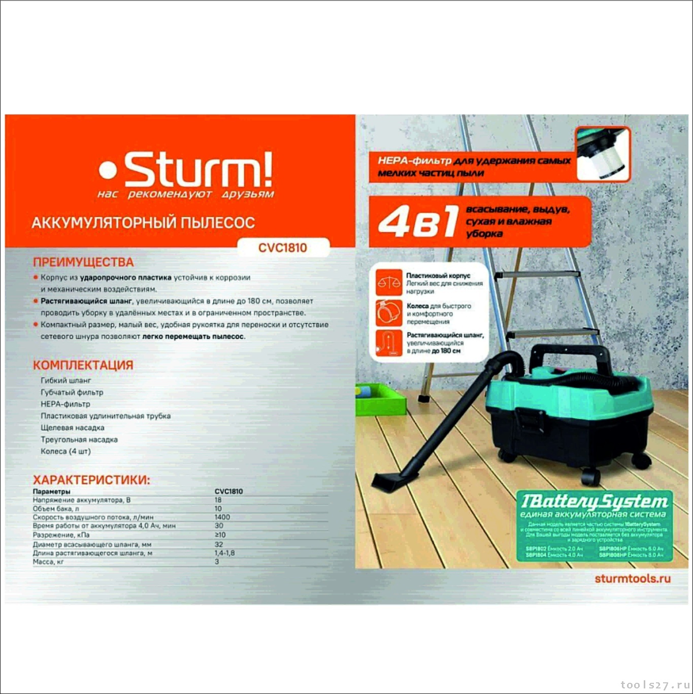 Пылесос аккумуляторный Sturm! CVC1810 1BatterySystem: CVC1810 (1400)