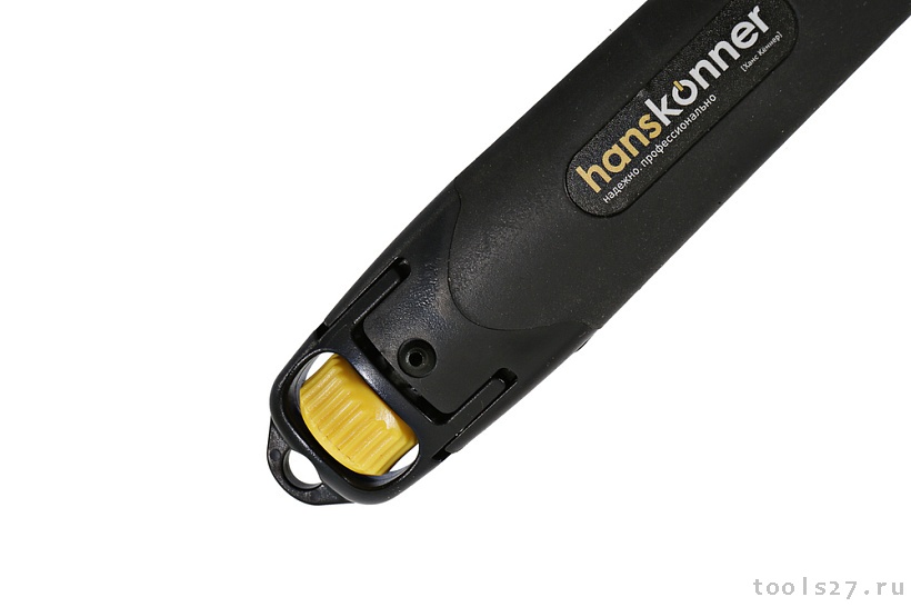 Строительный нож Hanskonner SolidFixation (усиленная фиксация лезвия) подходит для работ с высокими нагрузками, требующих повышенной точности и интенсивности. Благодаря корпусу из чистого высококачественного пластика и сверхпрочной металлической направляющей достигается улучшенная устойчивость конструкции при давлении на инструмент. Обрезиненная поверхность с упором под большой палец обеспечивает полный контроль ножа. Лезвие из высококачественной стали SK2 с трёхгранной заточкой и дополнительной обработкой лазером служит в 5 раз дольше стандартного. Уникальный запатентованный фиксирующий винт плотно прижимает режущий элемент к направляющей, что позволяет полностью передать усилие на рабочую кромку.