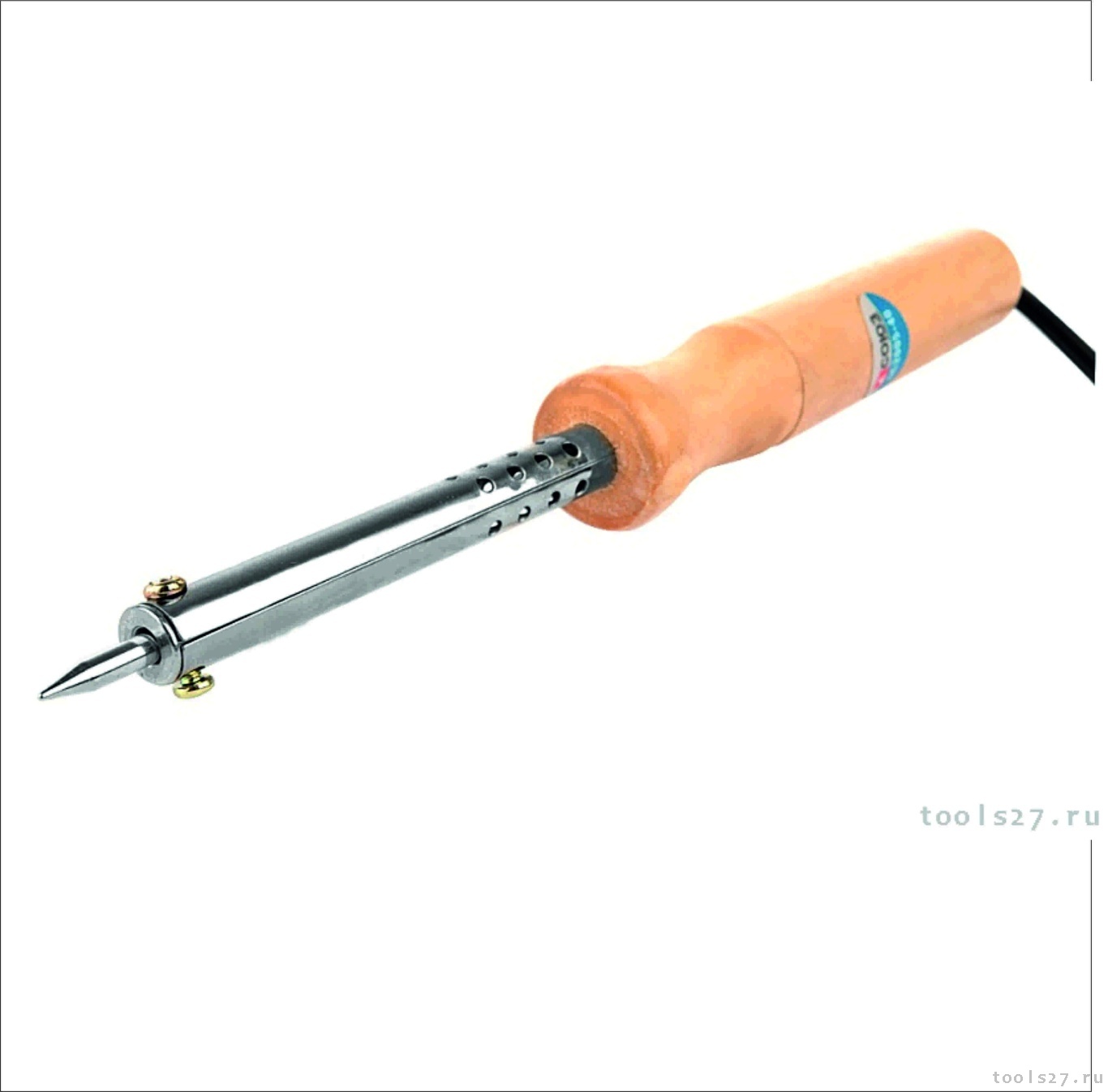 - Паяльник с деревянной позволяет быстро и качественно осуществить спайку различных электронных элементов как в специализированных, так и в бытовых условиях. Применение данного инструмента не требует от пользователя специальных знаний и умений , т.к. он прост в эксплуатации.
