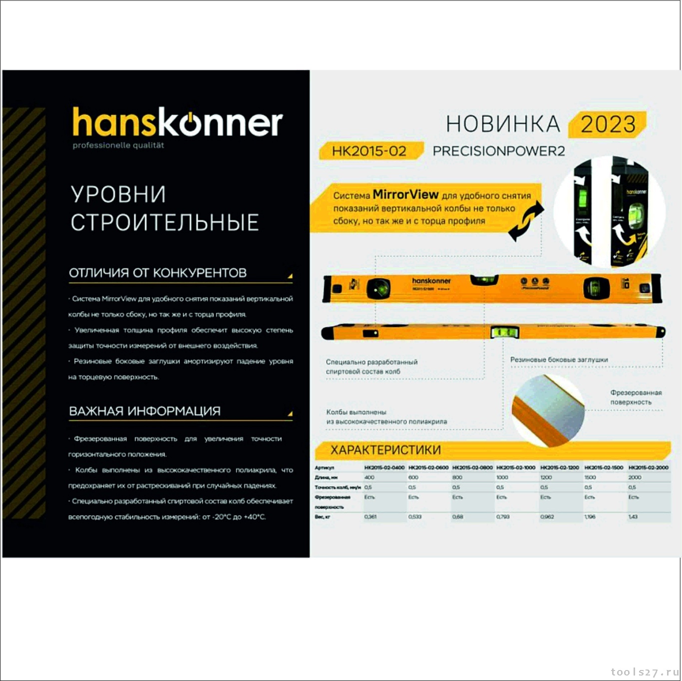 Уровень 2000 мм, фрезеров., 3 глазка (1 зеркальн.), точн. 0.5мм/м, Hanskonner HK2015-02-2000 (1564)