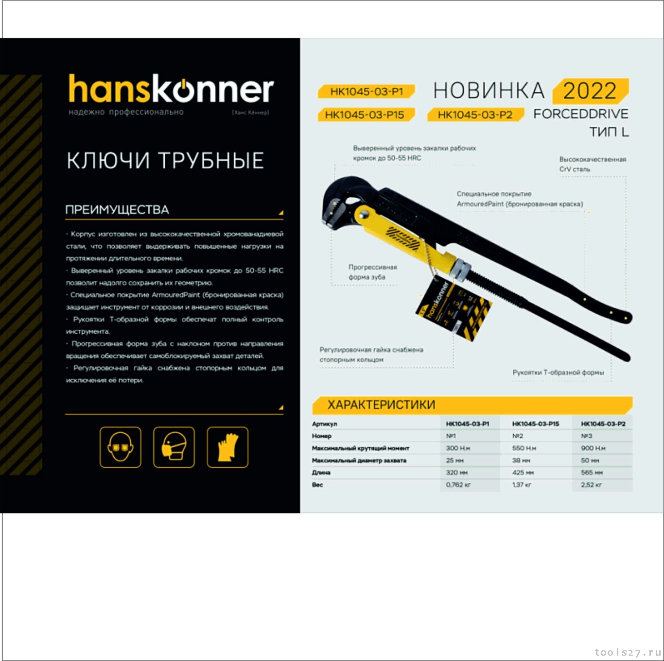 Ключ трубный рычажный 1", №1, 320мм, Тип L (90°), CrV сталь, Hanskonner HK1045-03-P1 (1602)