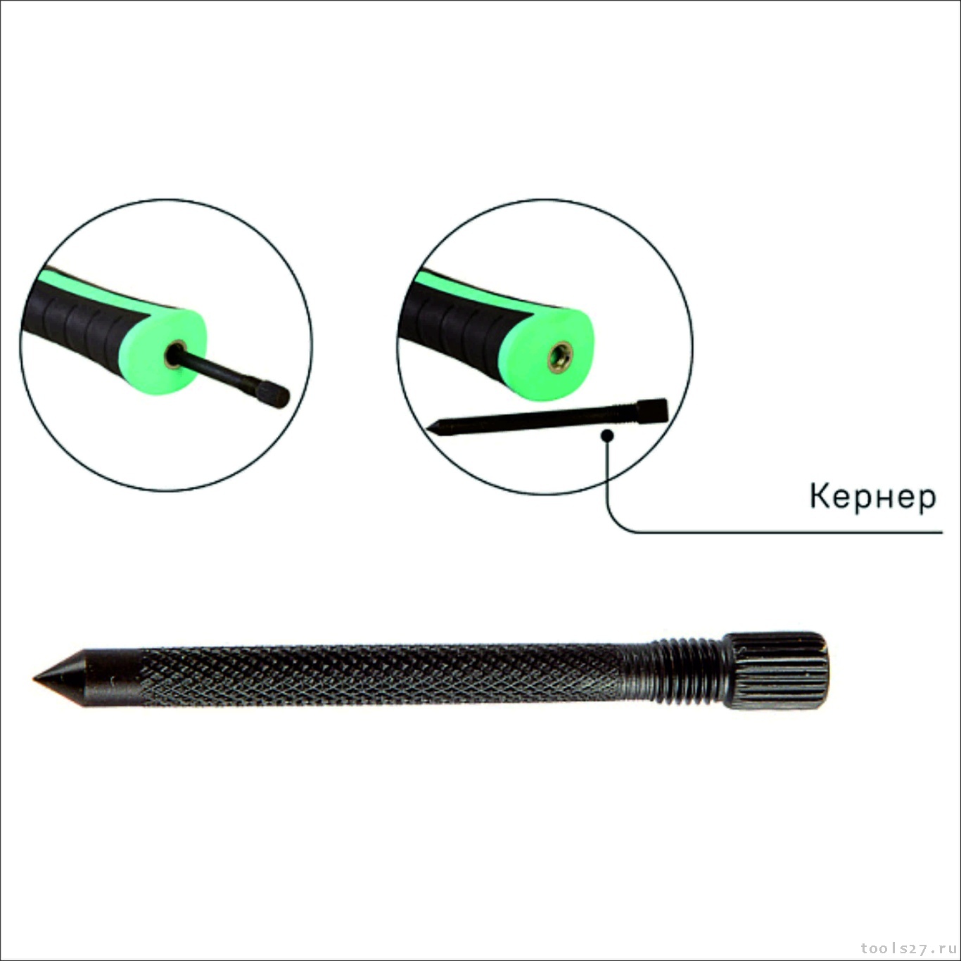 Предназначен для насечки центральных лунок (кернов) для начальной установки сверла и иной визуальной разметки