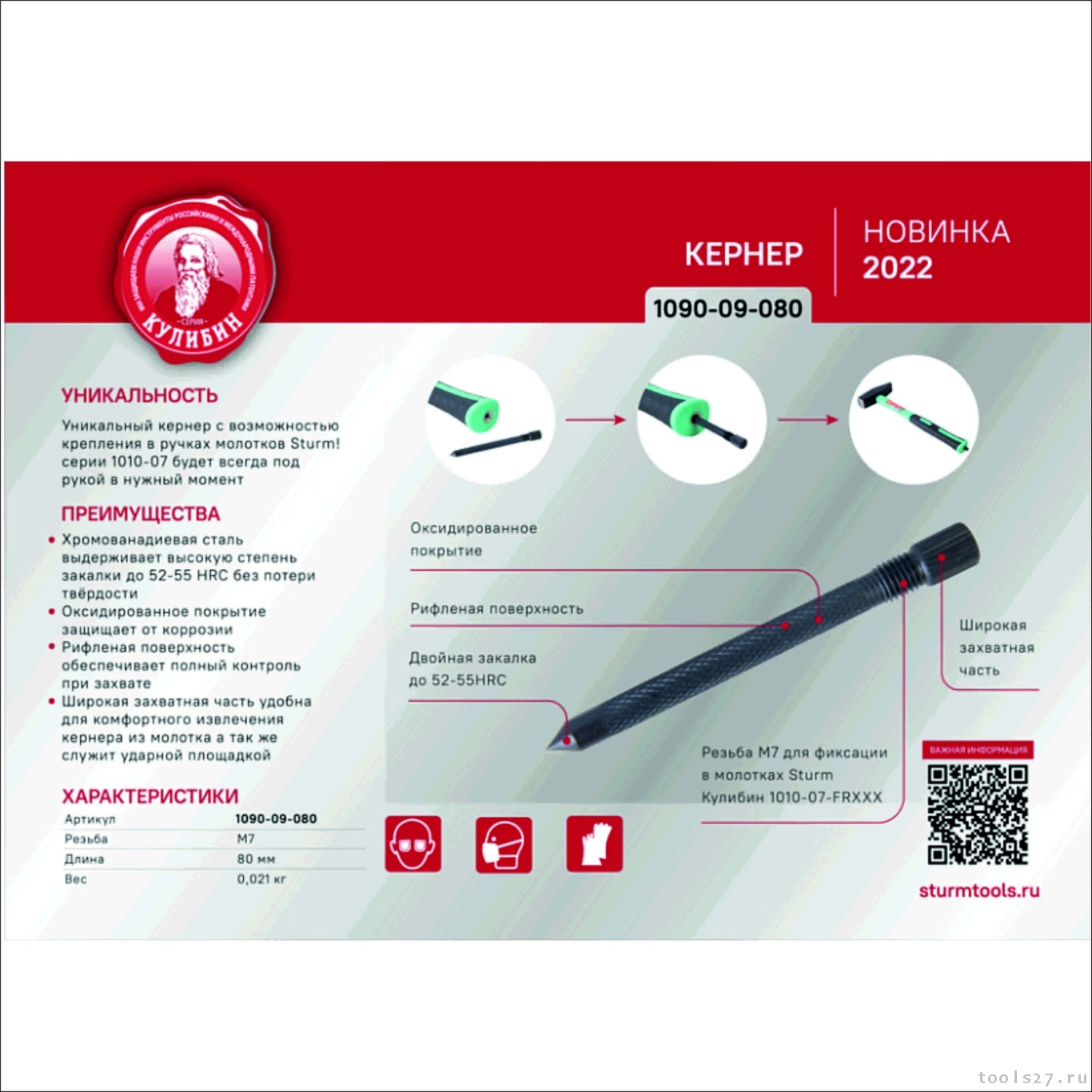 Уникальная запатентованная система крепления кернера позволяет хранить его прямо в рукоятке молотков Sturm! серии 1010-07Резьбовая фиксация кернера исключает случайную потерю, широкая рифленая захватная часть служит для удобного извлечения и возврата на место Кернер выполнен из CrV стали и закалён до 48-52 HRC, что позволяет ему работать с твёрдыми металлами Оксидированная поверхность кернера защищает его от коррозии