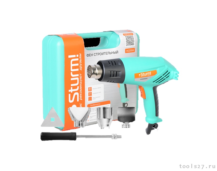 Sturm HG2004 — мощный универсальный технический фен бытового назначения. Инструмент обладает небольшими размерами и массой, за счет чего максимально удобен в использовании и отлично подходит для работ в условиях ограниченного пространства. Надежность хвата обеспечивают резиновые накладки на рукояти. Устройство может использоваться не только как мобильное, но и как стационарное — особая форма корпуса со специальной ребристой площадкой позволяет для большего удобства устанавливать фен в вертикальном положении, либо под углом в 15°. Модель имеет два режима работы, выбор между которыми производится с помощью переключателя. Режим пониженной производительности обеспечивает максимальную температуру нагрева в 350°C при скорости выдува воздушного потока 250 л/мин, режим повышенной производительности — максимальная температура нагрева 550°C при скорости выдува воздушного потока 550 л/мин — в зависимости от конкретной задачи пользователь выбирает наиболее подходящий.