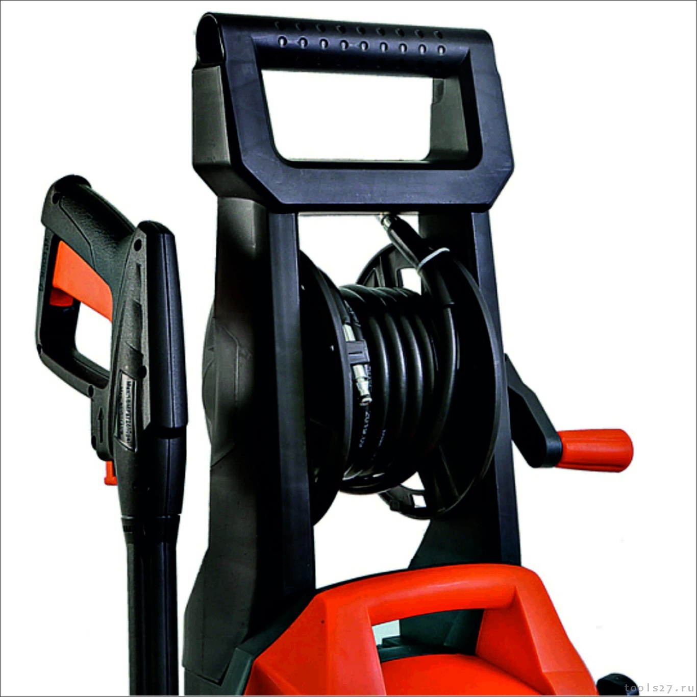 -Увеличенный до 7м эластичный шланг высокого давления на барабане позволяет свободно мыть автомобиль, чистить крыши дачных построек и другие объекты не передвигая мойку. Благодаря своей эластичности шланг легко разматывается и сматывается на барабан, не спутывается во время работы
