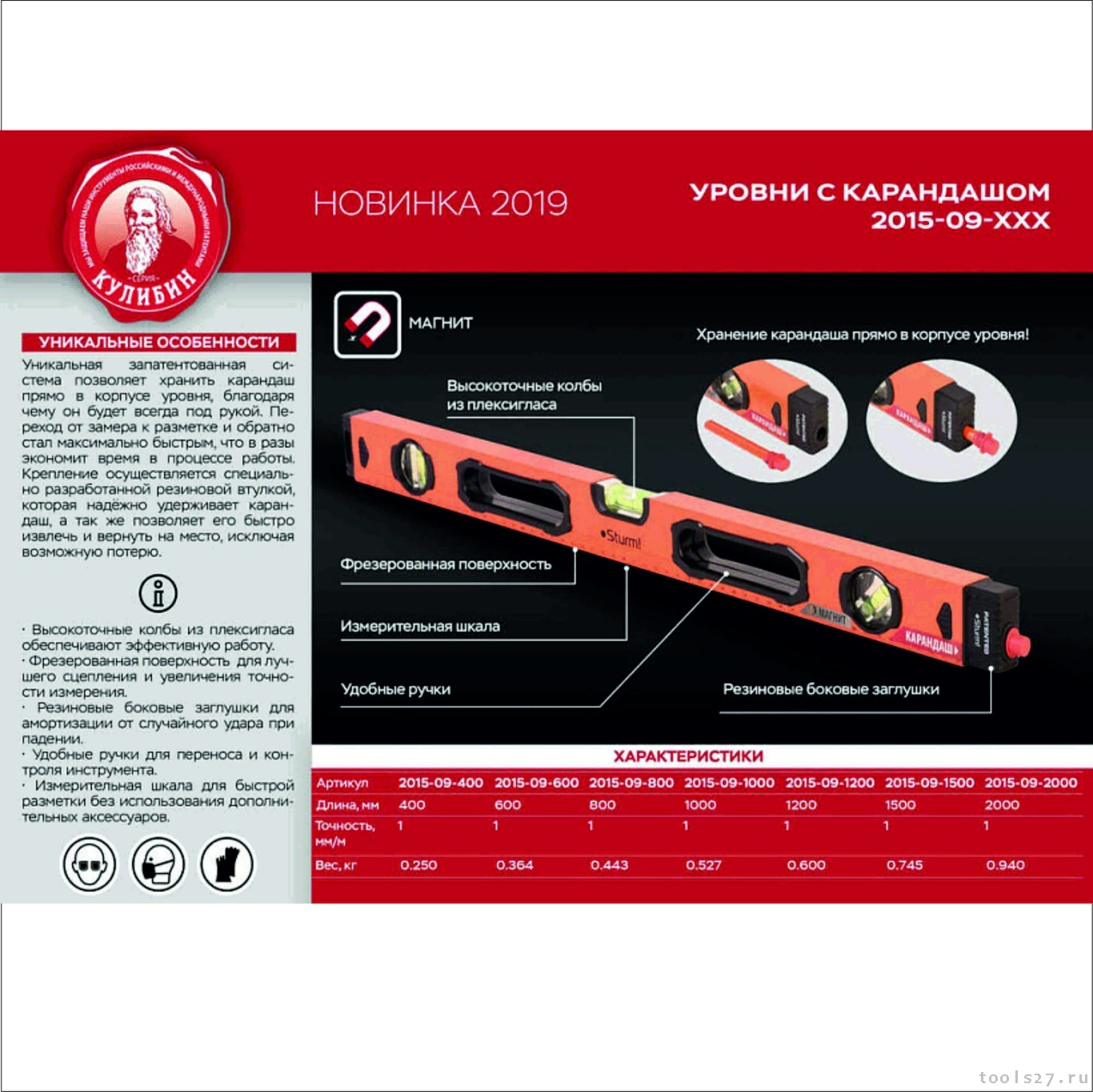 Переход от замера к разметке и обратно стал максимально быстрым, что в разы экономит время в процессе работы. Крепление осуществляется специально разработанной резиновой втулкой, которая надёжно удерживает карандаш, а также позволяет его быстро извлечь и вернуть на место, исключая возможную потерю. 3 высокоточные колбы из ударопрочного плексигласа, литой цельнометаллический профиль, стойкость к ударам, фрезерованная поверхность для лучшего сцепления с поверхностью и увеличения точности измерения, магнит, измерительная шкала, ручки для переноса.
