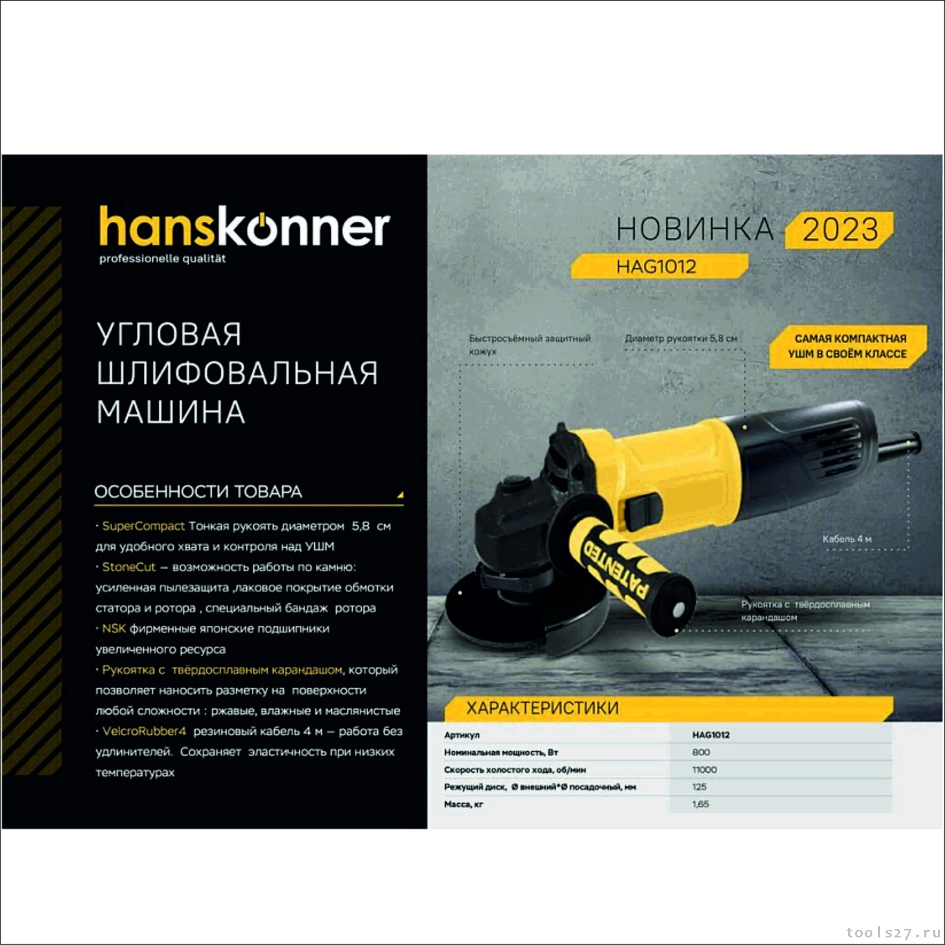 Угловая шлифовальная машина Hanskonner HAG1012 — максимально компактный и удобный электроинструмент для шлифования и зачистки поверхностей, а также резки металлов, кирпича, керамики или камня без использования воды. Максимально компактный корпус данной модели позволяет уверенно выполнять все виды работ задействуя только одну руку.