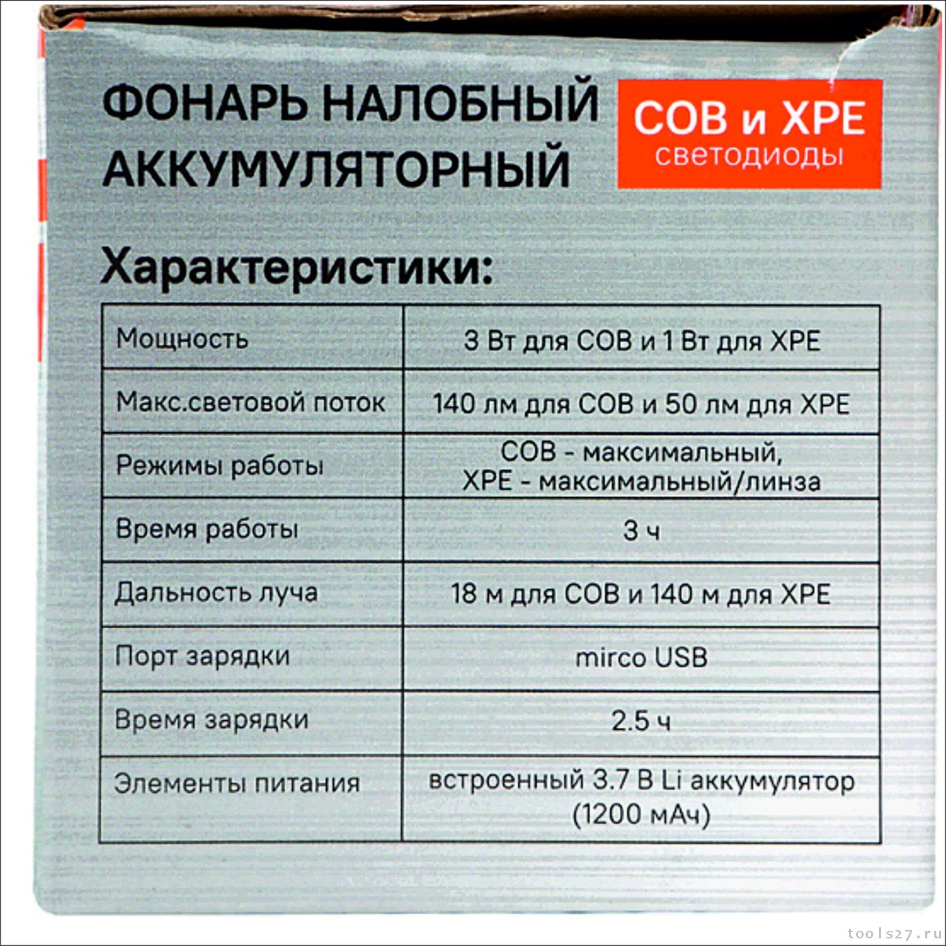 Режимы работы: COB - максимальный, XPE - максимальный/линза