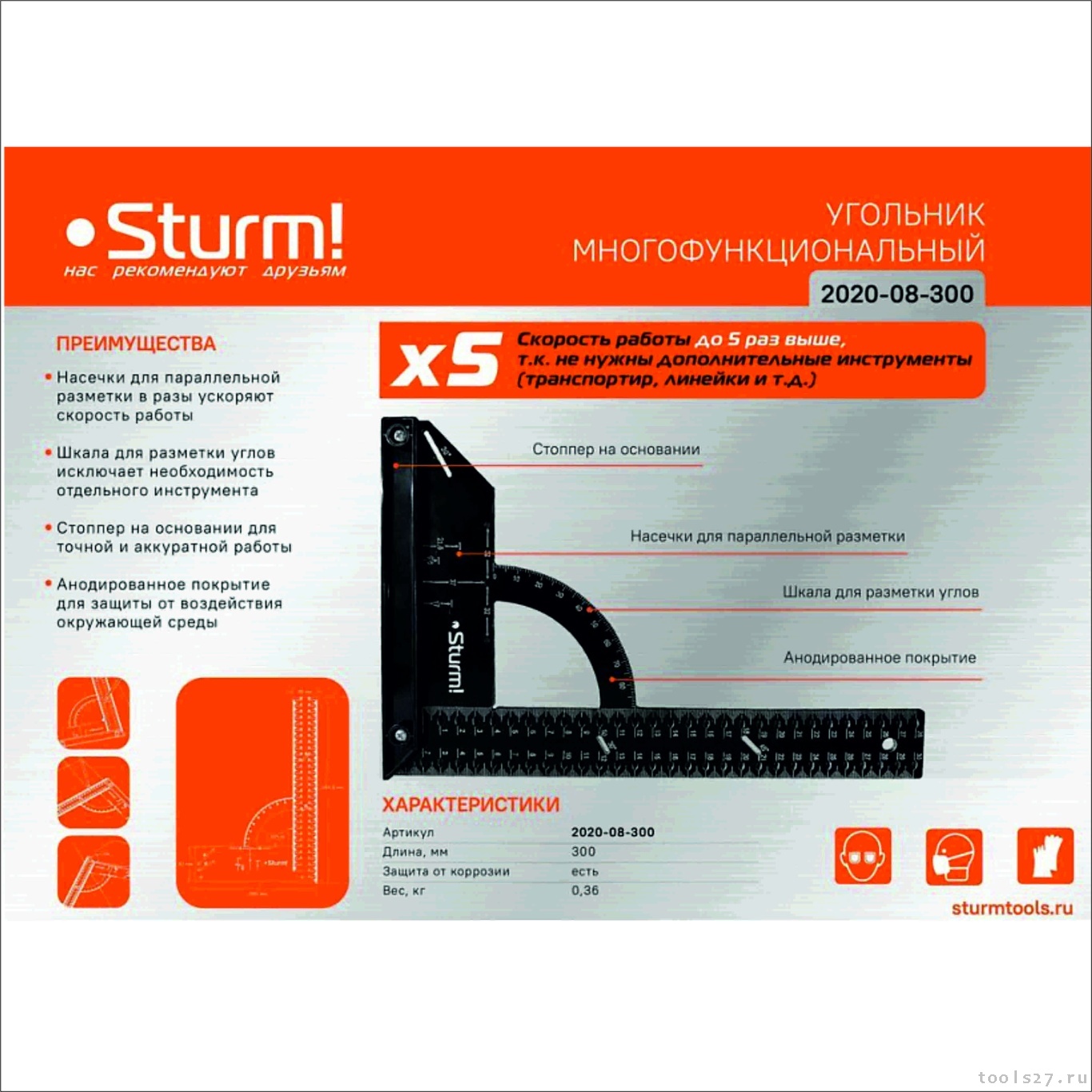 Угольник 200x300мм, разметочный, со стоппером, Sturm! 2020-08-300 (1836)