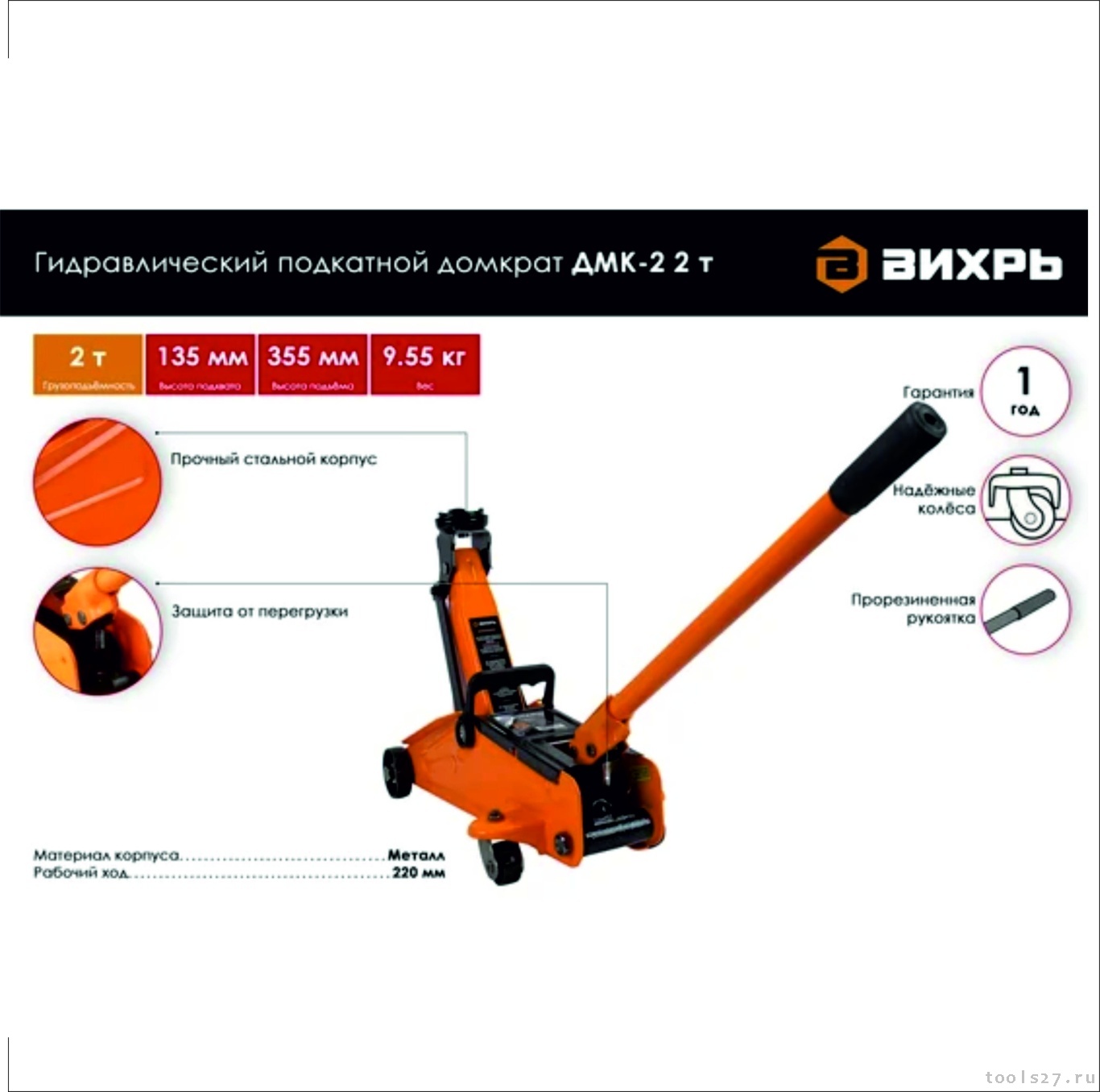 Домкрат гидравлический подкатной Вихрь ДМК-2 2 т, 135-355 мм 73/5/4/2 (1888)