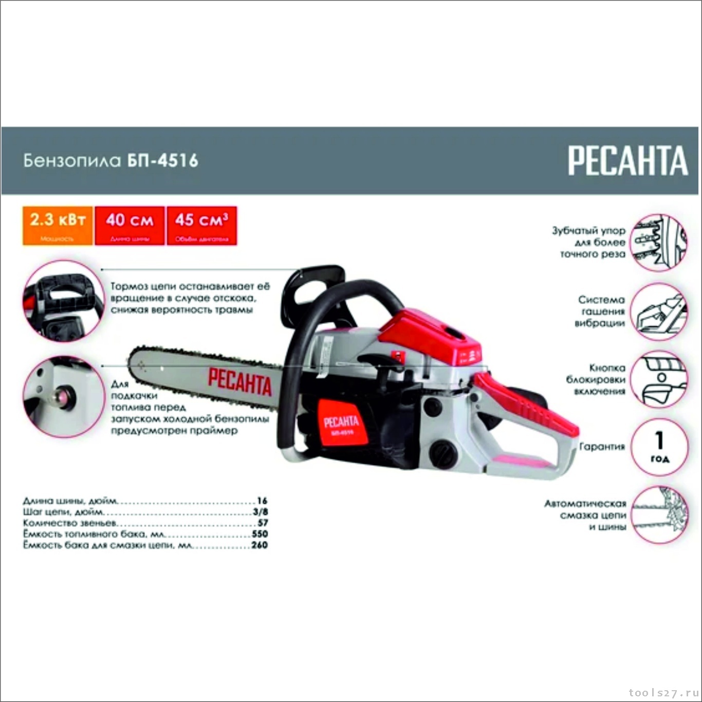 Использование бензопилы Ресанта БП-4516 не вызывает затруднений даже у новичков, она оснащена системой облегченного запуска «Легкий старт», которая обеспечивает плавный пуск инструмента. Количество вибраций при работе двигателя минимально благодаря применению современной амортизации из трех демпфирующих втулок.