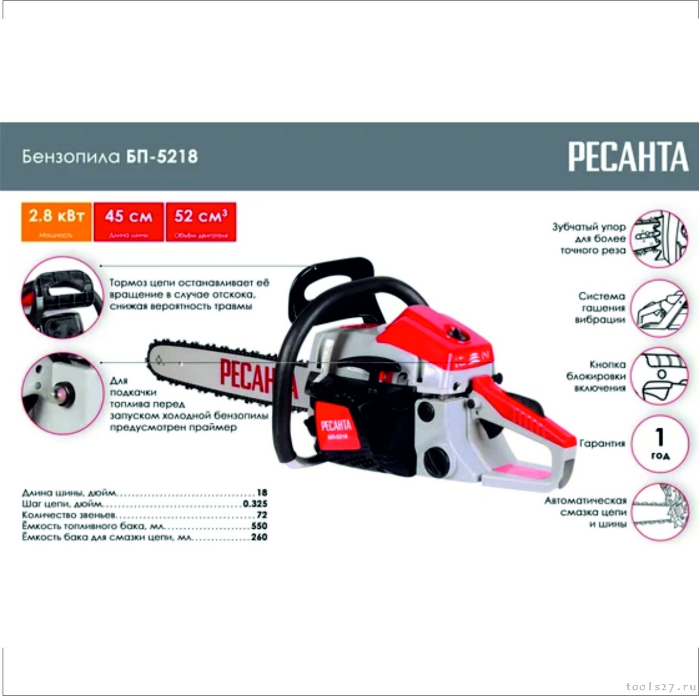 Ресанта БП-5218 оснащена тормозом цепи, который защищает оператора от отскока во время работы. Дополнительный комфорт обеспечивает продуманная система амортизации, состоящая из 3 демпфирующих втулок.