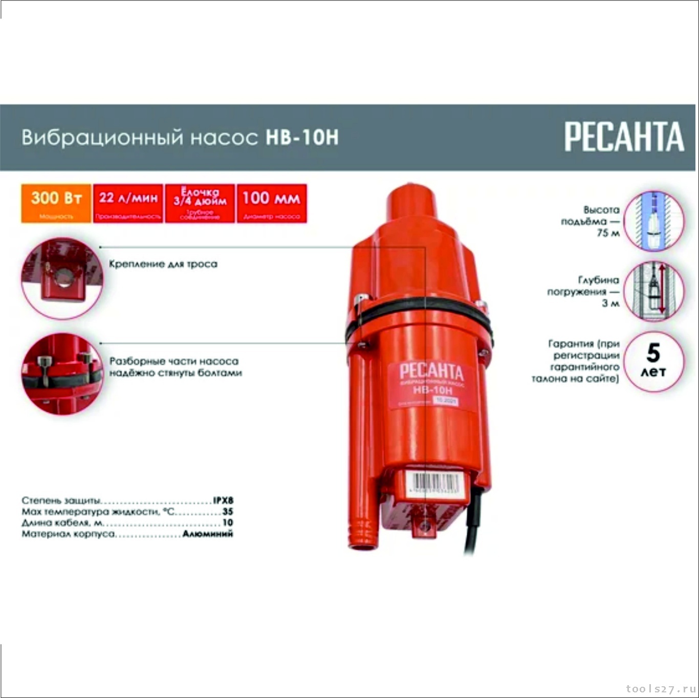 Модель Ресанта НВ-10Н имеет герметичную конструкцию, что обеспечивает стабильное функционирование агрегата в течение длительного времени в погружённом состоянии. Степень защиты – IPX8. Вибрационный насос не содержит сложных вращающихся деталей, поэтому не требует какого-либо технического обслуживания. В комплект входит сетевой кабель длиной 10 м и трос для подвешивания внутри скважины или колодца. Питание насоса осуществляется от бытовой электросети – 220 В, 50 Гц.