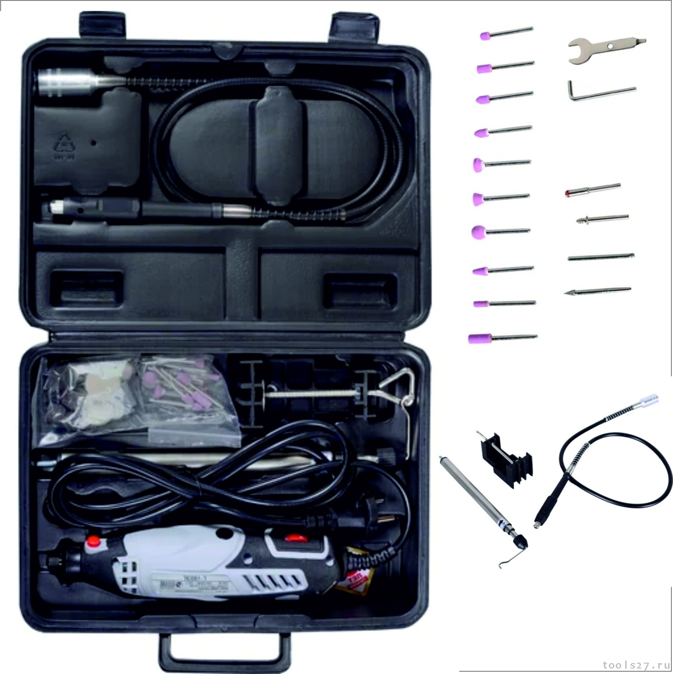 Электрический гравер Ресанта Г-180ЭГ поставляется в прочном пластиковом кейсе. Это удобно для хранения самого инструмента и многочисленных насадок. Компактные размеры и малый вес 0,7 кг делают рабочий процесс комфортным. Металлическое кольцо на корпусе позволяет подвешивать гравер на штатив. Пластиковая струбцина предназначена для удобного размещения инструмента во время использования. Кнопка блокировки шпинделя позволяет быстро заменить оснастку. Система защиты от перегрузок с вентиляционными отверстиями на корпусе препятствует перегреву и обеспечивает длительный срок службы. В комплект входит набор насадок и рабочих принадлежностей, ключ для цангового патрона.