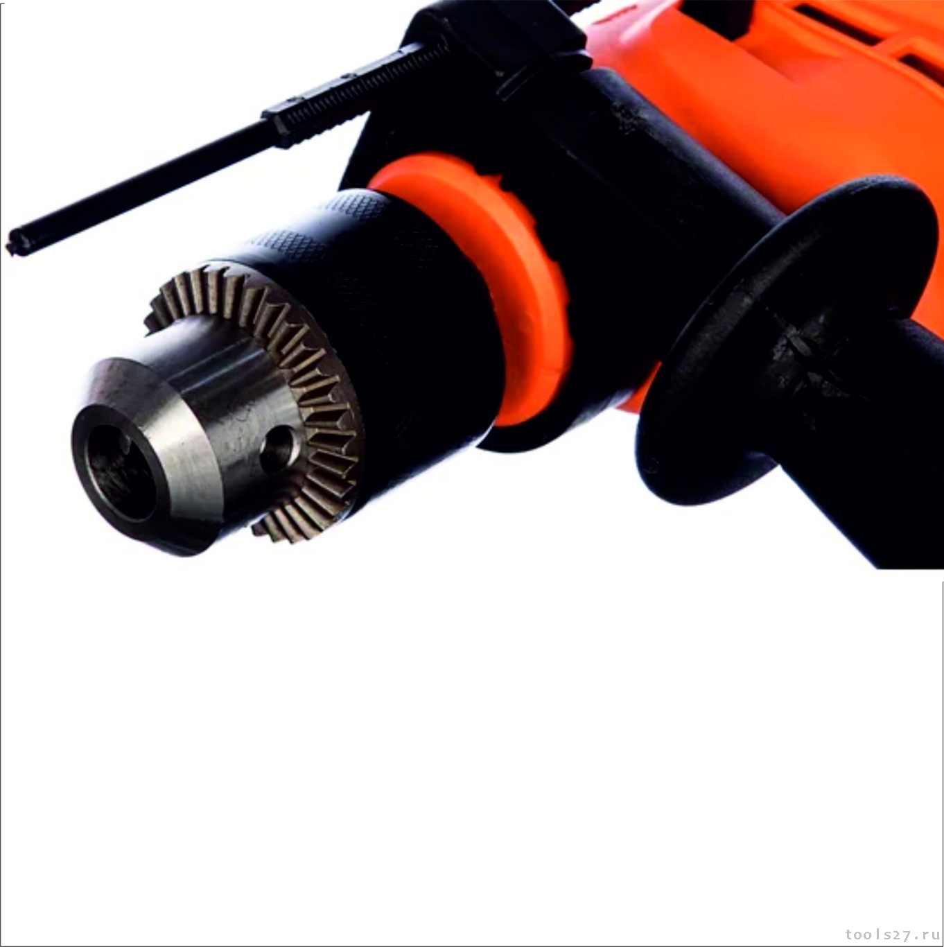 Оснастка крепится в ключевом патроне диаметром 1,5-13 мм. Такая фиксация является надежной и исключает ослабление сверла во время вращения. Инструмент позволяет делать отверстия до 13 мм в стальных поверхностях, до 15 мм в бетоне, до 25 мм в дереве. Наличие ударного механизма облегчает работу с бетонными и каменными основаниями. Электродрель можно использовать в качестве шуруповерта, шлифовальной машины при условии соответствия оснастки ключевому патрону устройства. Возможность регулировки оборотов позволяет подбирать оптимальный режим для каждого конкретного случая. Режим реверса поможет легко выкрутить застрявшее сверло или крепеж. Устройство оснащено ограничителем глубины сверления, который облегчает процесс подготовки отверстий нужных параметров. Кнопка выключения имеет фиксатор, что избавляет от необходимости постоянно держать ее нажатой. Дрель весит 1,8 кг, для удобства удержания она оснащена дополнительной ручкой в передней части корпуса.