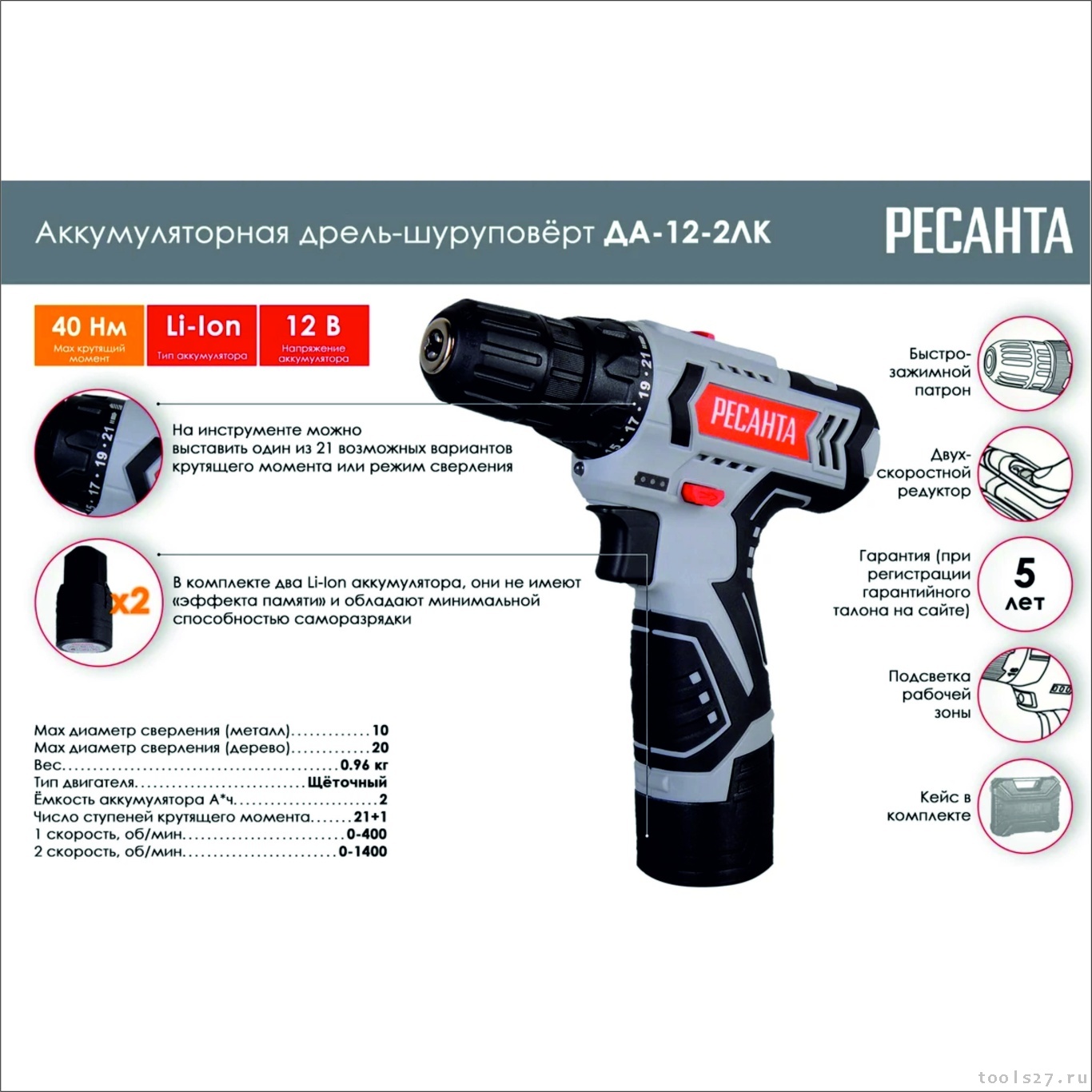 Компактная и эффективная модель Ресанта ДА-12-2Л станет оптимальным выбором для сверления отверстий, фиксации и выкручивания крепежа в быту при решении несложных задач.