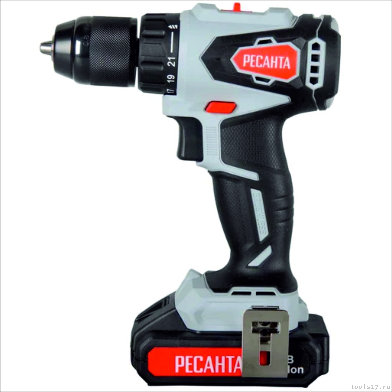 Модель работает от аккумулятора Li-Ion, не обладающего «эффектом памяти» и способного заряжаться из любого состояния. В комплект прилагается дополнительный аккумулятор, что позволяет увеличить длительность рабочего процесса без подзарядки. Патрон рассчитан на сверла разной величины (от 0,8 до 10 мм), благодаря быстрозажимной конструкции замена осуществляется моментально. Максимальный диаметр сверления для дерева составляет 30 мм, для металла – 12 мм. Наличие двухскоростного редуктора позволяет выбрать оптимальную частоту вращения с учетом вида материала и его толщины. Обратный ход дает возможность осуществлять выкручивание или ослабление крепежа, быстро и легко высвобождать застрявшее сверло. Дрель-шуруповерт запускается нажатием клавиши пуска и мгновенно останавливается при ее отпускании. В устройстве предусмотрена блокировка шпинделя для защиты от случайного включения, а также подсветка рабочей зоны для комфортной работы в условиях слабого освещения. Инструмент поставляется в специальном кейсе для удобства хранения и транспортировки.