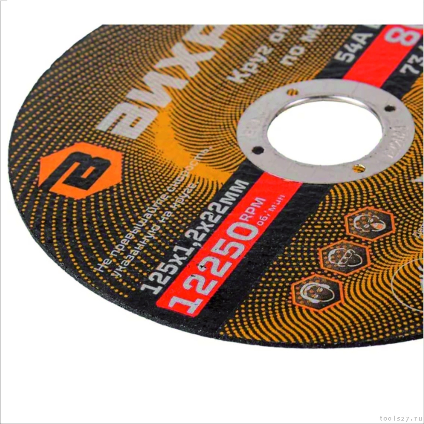Отрезной круг имеет посадочный диаметр 22 мм и диаметр диска 125 мм. Толщина круга составляет 1,2 мм. Максимальная скорость: до 12 250 об/мин. Отрезной круг обеспечивает быструю и чистую резку металла без заусенцев и брака. Специальная конструкция круга обеспечивает надежное сцепление с инструментом и предотвращает разрушение диска.
