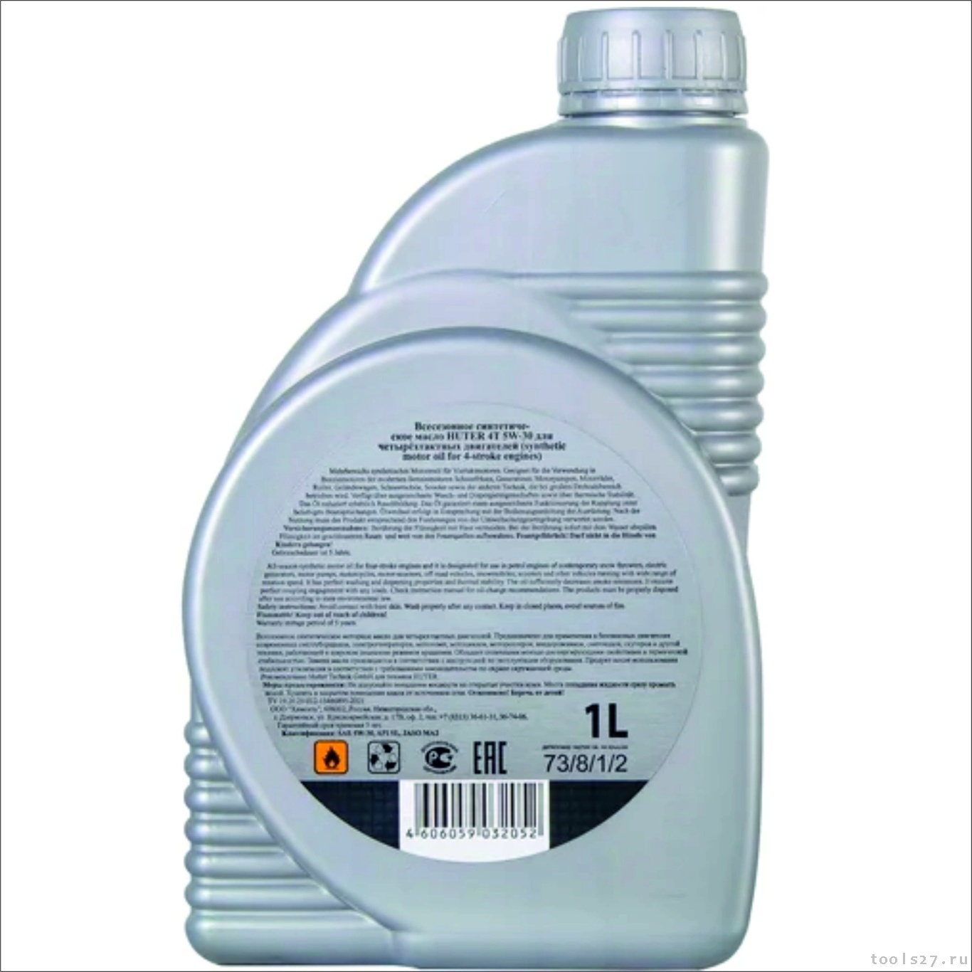 Масло отличается улучшенными смазывающими характеристиками, устойчивостью к разрушению при нагреве. Оно сохраняет свои свойства в температурном диапазоне от -30 до +40 градусов, обеспечивает легкий запуск двигателя в мороз и защиту механизма от износа. Моторное масло класса JASO MA2 имеет повышенный коэффициент трения и является оптимальным выбором для двигателей, подвергающихся интенсивным нагрузкам. Сертификат API SL гарантирует обеспечение защиты мотора от высокотемпературных отложений, более длительный период эксплуатации и низкую токсичность выхлопов. Благодаря использованию масла 5W-30 продукты окисления и загрязнения не оседают на элементах двигателя, а находятся в подвешенном состоянии, сохраняя механизм чистым. Масло способствует снижению износа, исключает образование задиров на трущихся поверхностях. Масло моторное 5W-30 синтетическое для четырёхтактных двигателей Huter поставляется в герметичной бутылке емкостью 1 л с рельефом для удобства удержания в руке и мерными делениями для более точной дозировки.