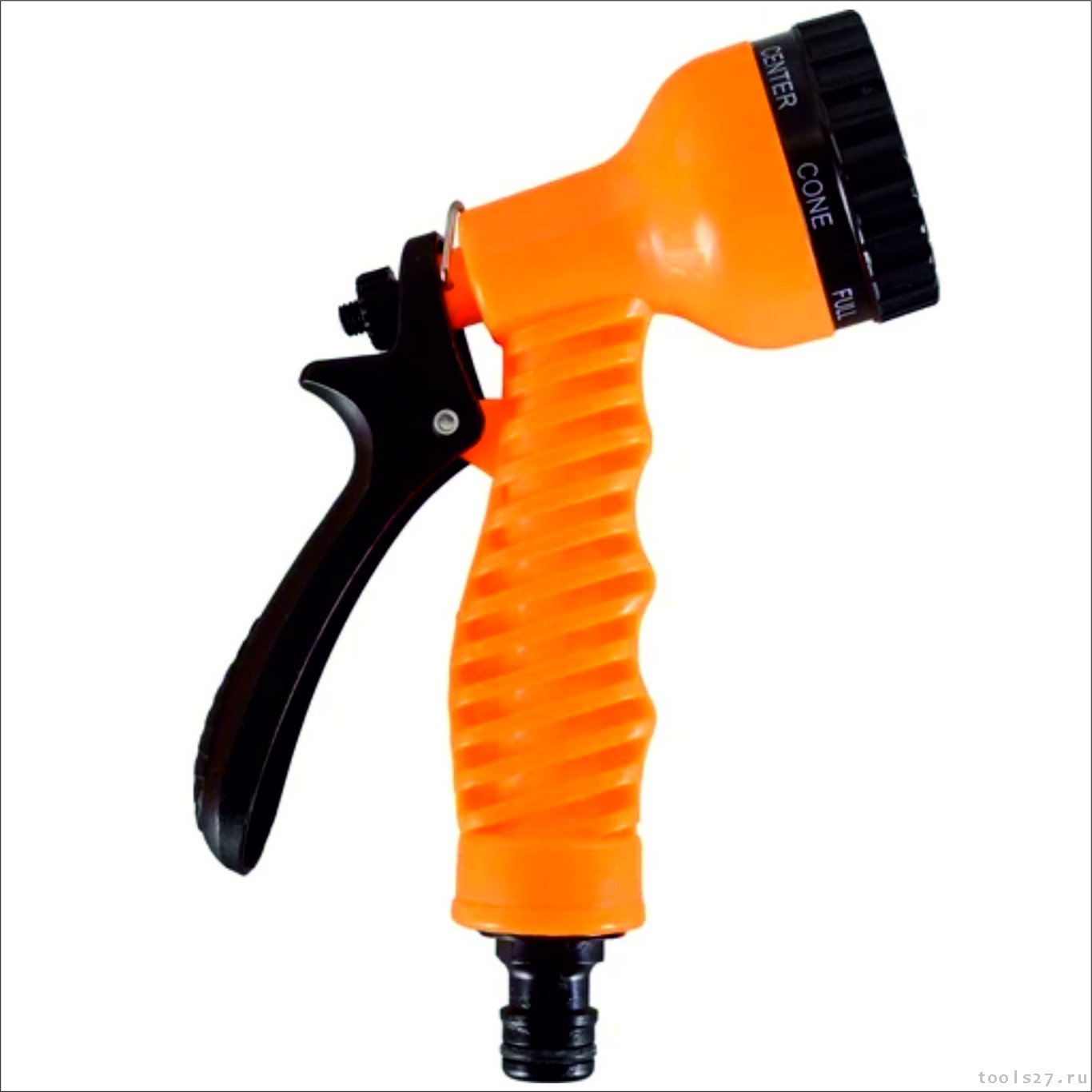 Распылитель выполнен из пластика и легко подключается к шлангу. Он имеет эргономичную рукоятку, которая служит для регулировки напора воды, что позволяет контролировать интенсивность полива. Это особенно важно при работе с молодыми растениями, которые не выдерживают сильного напора воды.