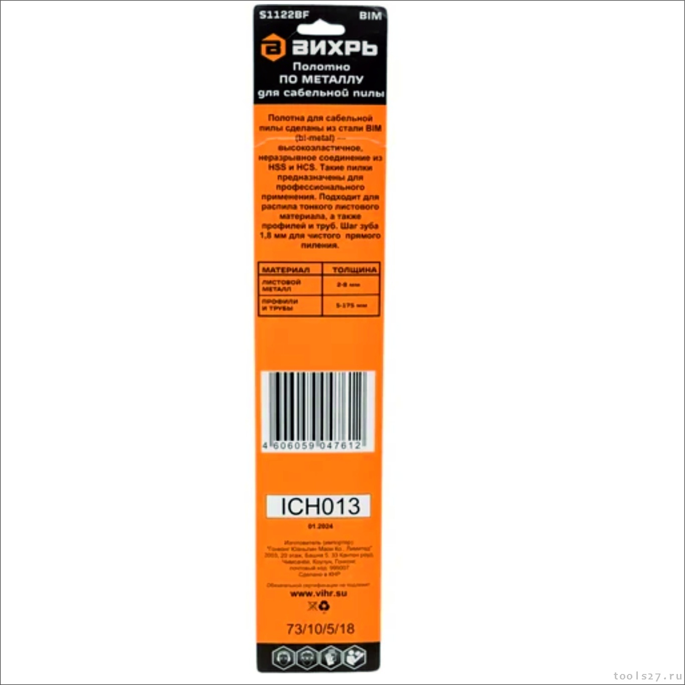 Полотно для сабельной пилы S1122BF по металлу 225 мм, 2 шт Вихрь 73/10/5/18 (1931)