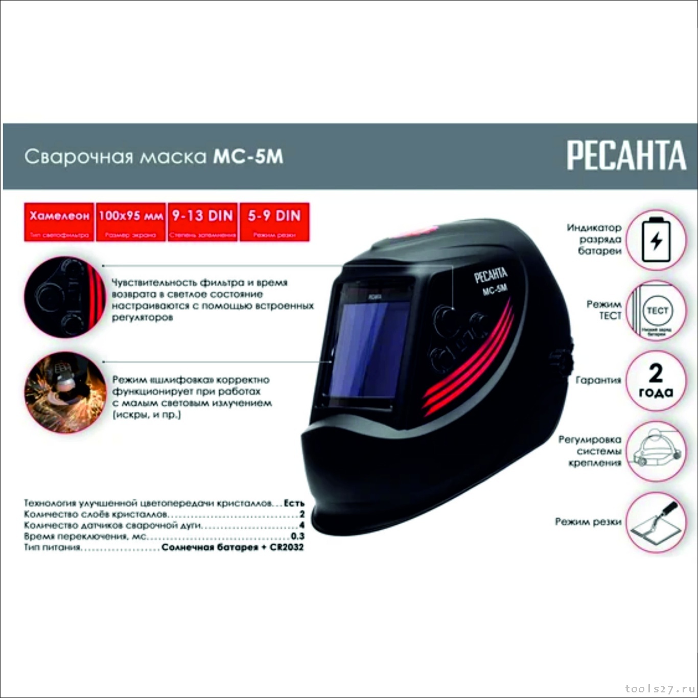 Устройство оснащено всеми необходимыми для безопасности пользователя функциями. Работоспособность можно проверить заранее, благодаря опции TEST. Автоматический светофильтр обеспечит затемнение смотрового окна за 1 мс сразу при появлении вспышки. После прекращения сварки затемнение сохраняется в течение еще 0.03 - 0.4 сек. Сварочная маска также имеет режим «шлифовка», благодаря которому она корректно функционирует при искрах, другом малом световом излучении. Возможность отрегулировать чувствительность позволяет подстроить маску под любые условия.