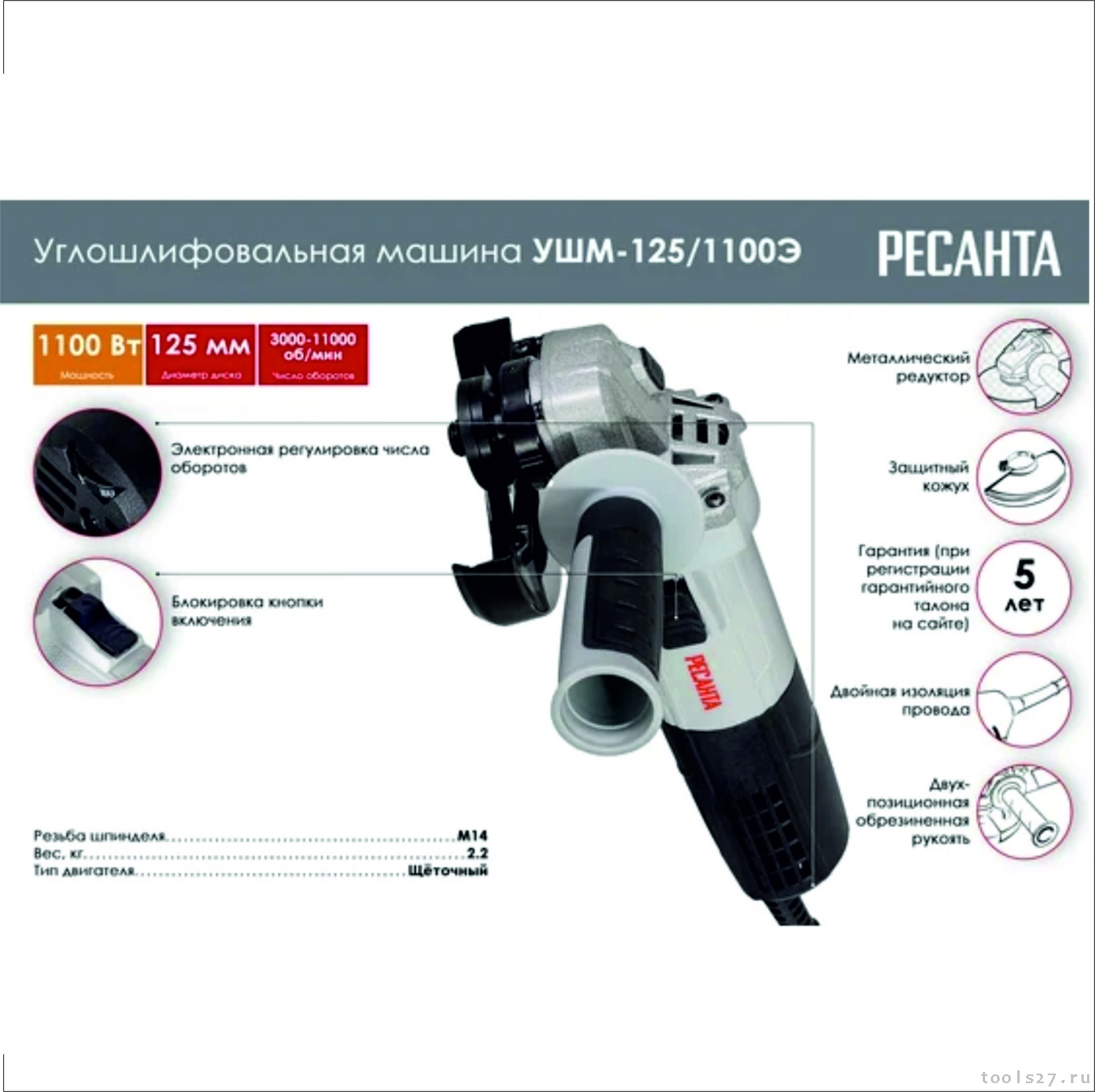 Модель угловой шлифмашины Ресанта УШМ-125/1100Э относится к категории самых распространённых ручных электроинструментов и широко используется для шлифования и резки металла. Может работать с другими материалами. Мощность составляет 1100 Вт. Эта УШМ оснащена системой электронного регулирования оборотов и обеспечивает вращение с частотой – 3000-11000 об/мин. Диаметр круга – 125 мм.