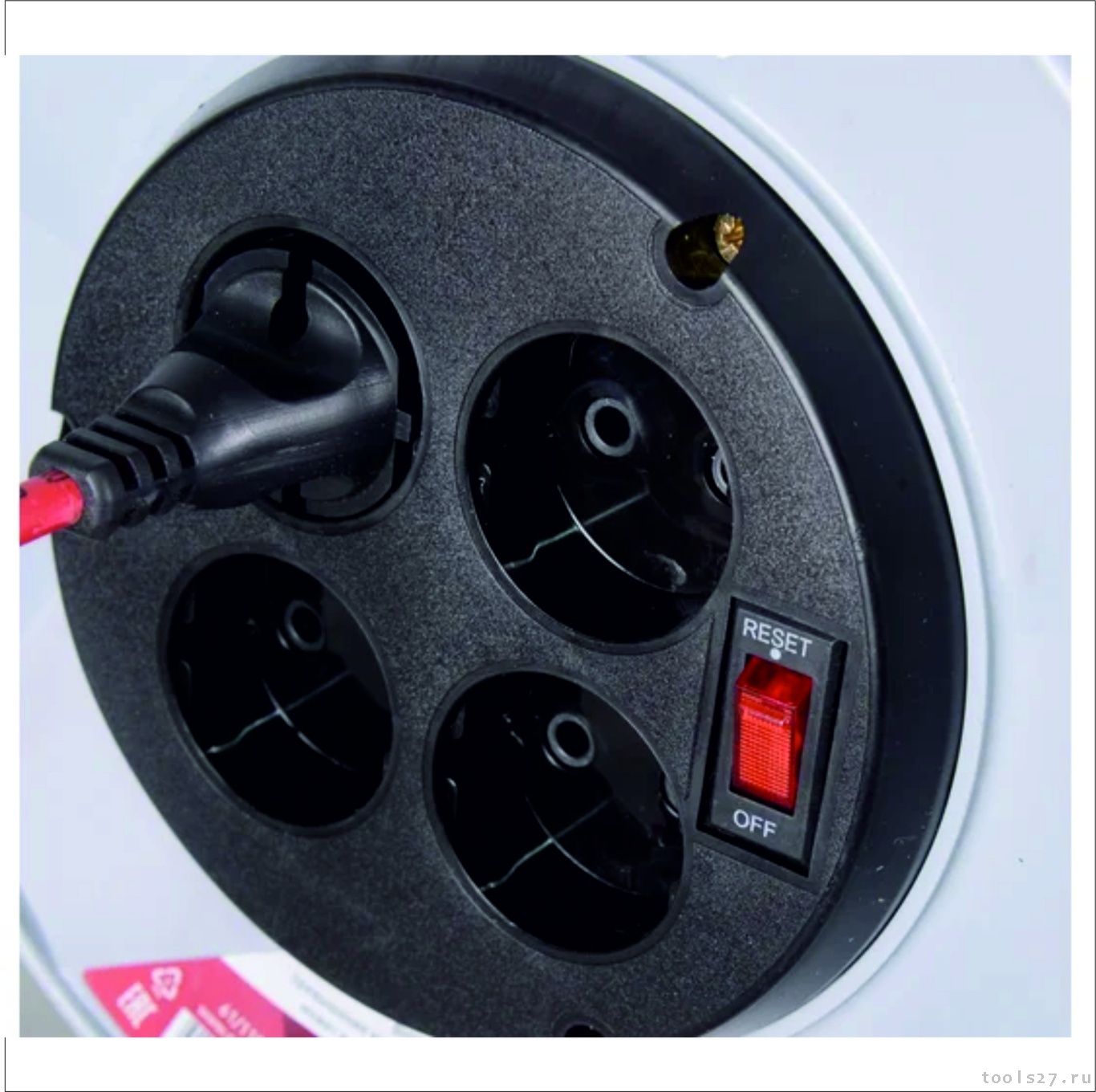 Пропускная мощность составляет от 1,1 кВт (в смотанном виде) до 2,2 кВт (в размотанном). Модель отлично подойдет для подключения мощного оборудования. Однако стоит помнить о том, что кабель в этом случае необходимо расправить.