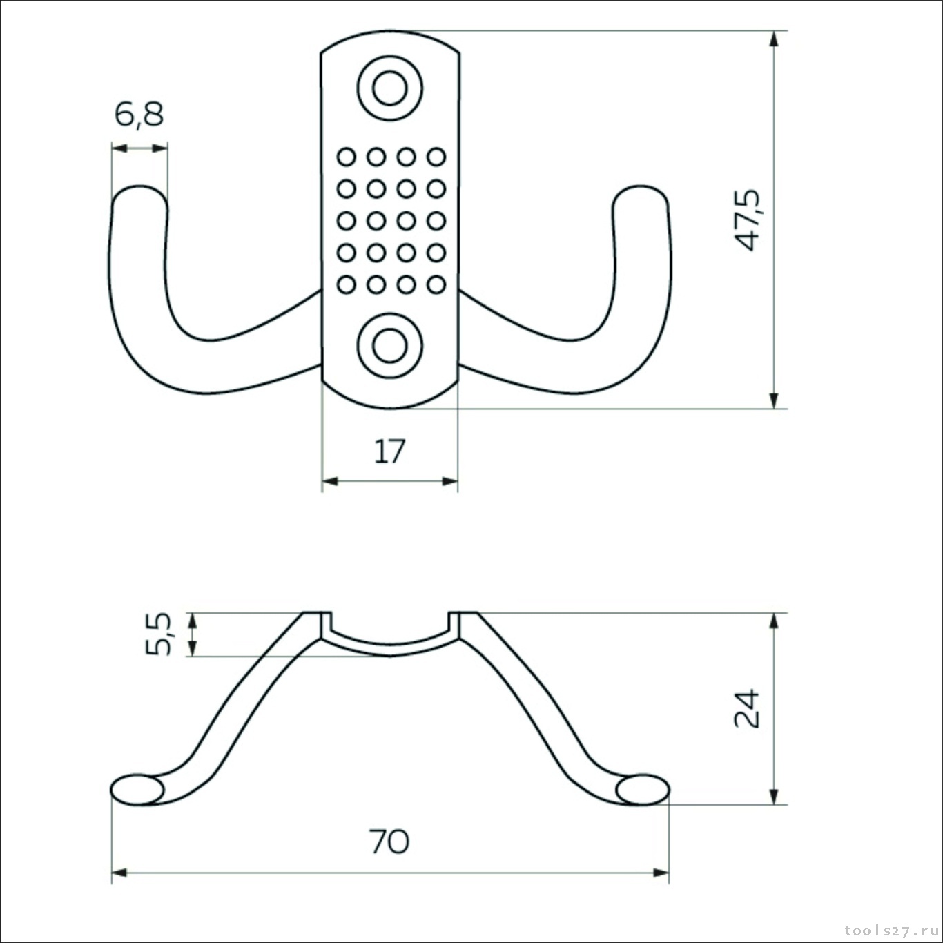 Облегченный держатель для одежды двойной (два рожка). 2х-рожковый с перфорированной декорацией, покрытие - матовый хром. Крепление при помощи винтов к плоскости. Максимальная допустимая нагрузка на крючок - до 15 кг. Размер: 30х75х58 мм. Расстояние между установочными отверстиями 32 мм. Light серия.