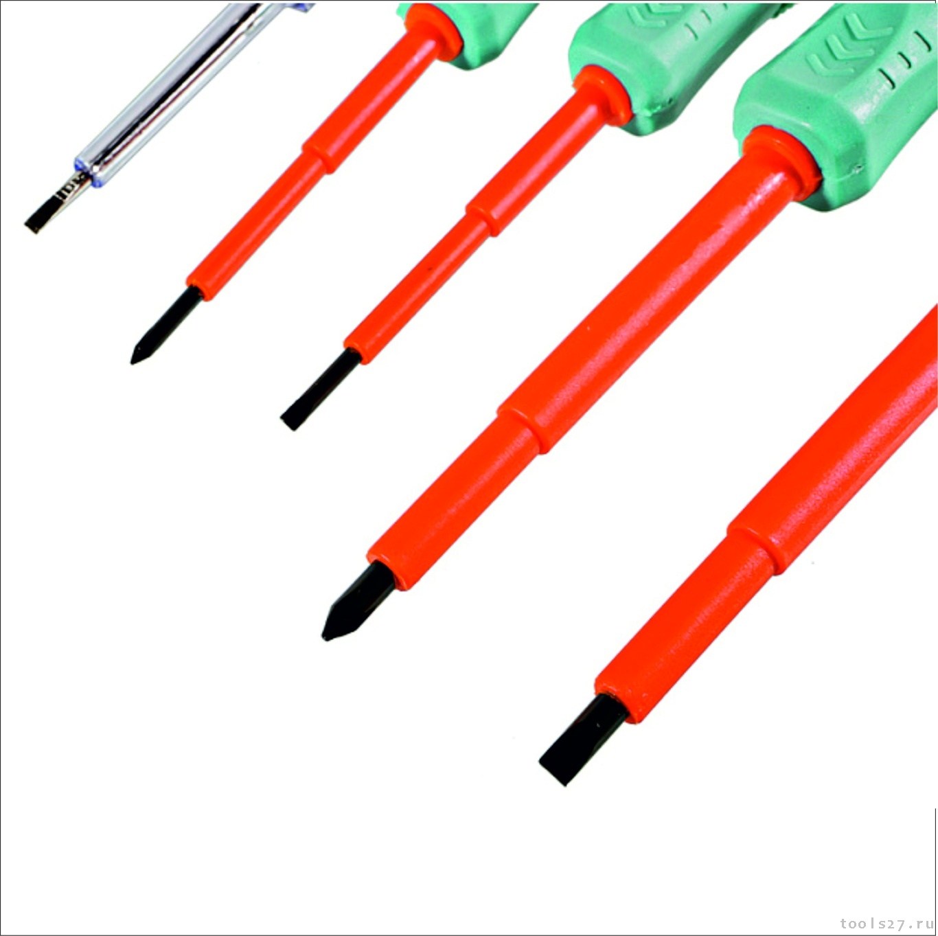 В комплект входит 4 диэлектрические отвертки : SL3x75, SL5x100 PH0x75, PH1x100; и 1 тестер напряжения.