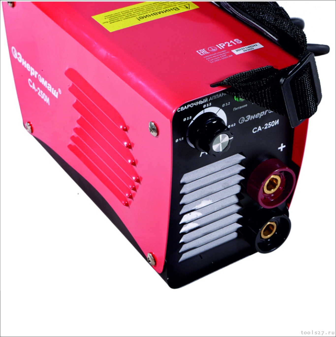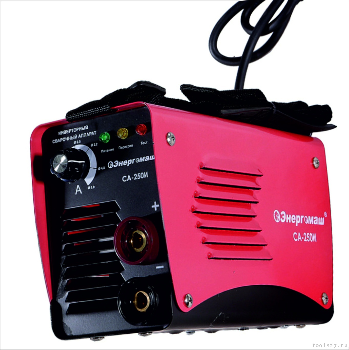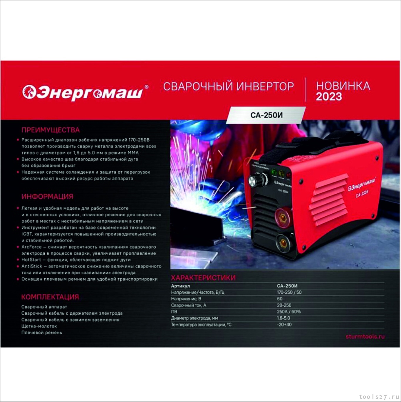 Энергомаш СА-250И – компактный и эргономичный сварочный инвертор – легкая и удобная модель для работ на высоте и в стесненных условиях. Инструмент разработан на базе современной технологии IGBT, характеризуется повышенной производительностью и стабильностью работы, при минимальном нагреве. Предназначен для работы с электродами диаметром от 1.6 до 5 мм. Аппарат способен уверенно выполнять, как деликатные швы в тонколистовых материалах, так и работать с массивными металлическими конструкциями. Модель имеет плавную регулировку сварочного тока в диапазоне от 20 до 250А, что позволяет сваривать детали любой конфигурации, гарантируя стабильную дугу без образования брызг, для получения оптимально прочного и однородного шва. Инвертор прост в использовании даже для начинающих пользователей и имеет широкий набор функций, обеспечивающих дополнительное удобство и легкость работы: Hot Start ''быстрый поджиг дуги'' – автоматически повышает сварочный ток, что облегчает поджиг дуги и делает ее более стабильной, Arc Force ''форсаж дуги'' – автоматически регулирует сварочный ток при сокращении межэлектродного расстояния, что позволяет без залипания получить прочный шов, Anti-Stick ''антизалипание электрода'' – уменьшает сварочный ток, препятствуя прилипанию электрода к поверхности заготовки. Также, аппарат обладает защитой от перепадов напряжения и способен переносить колебания напряжения в сети – это обеспечивает уверенную работу инвертора в условиях, где состояние электросети не является ид