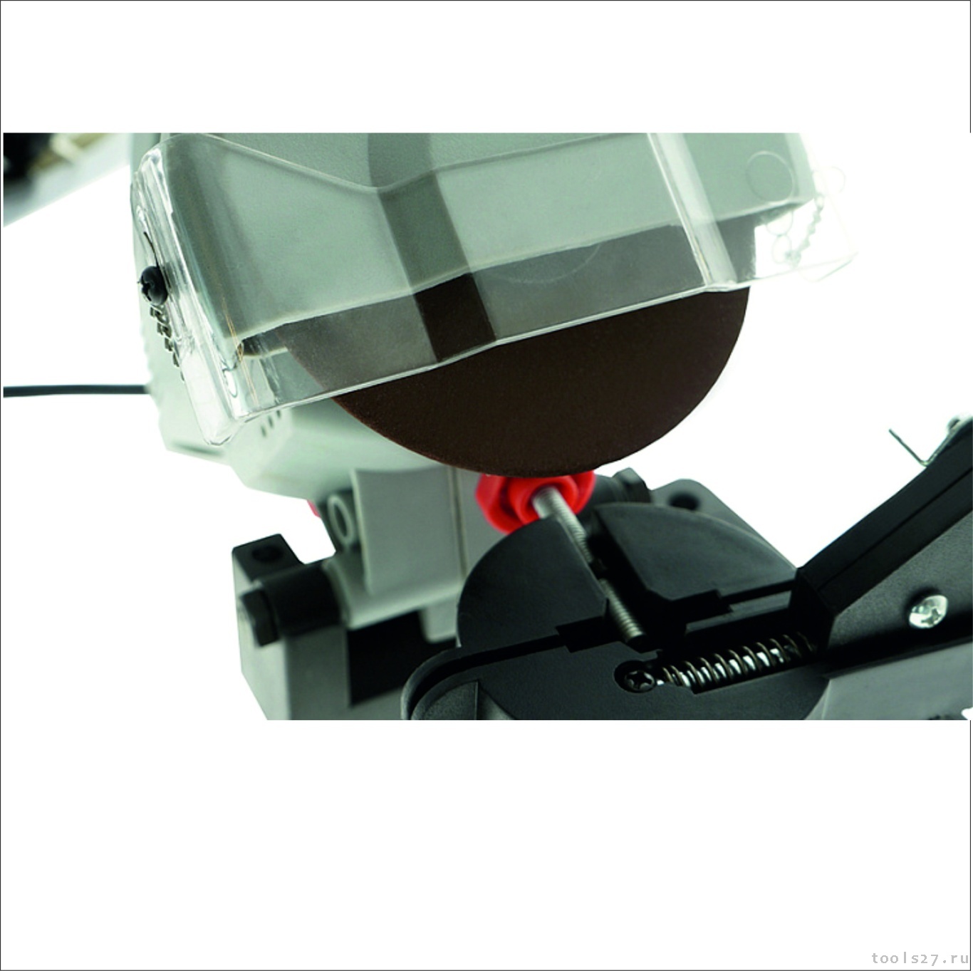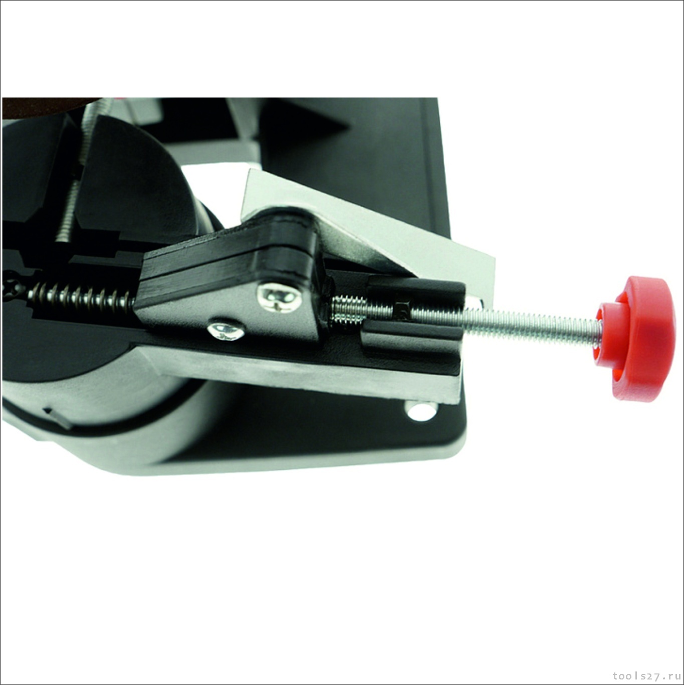 Для большей безопасности во время заточки в модели применена винтовая и клиновая фиксация обрабатываемого элемента, препятствующая его смещению и выскальзыванию из рабочего ручейка. Прижимной механизм обеспечивает точность зажима зубьев цепи под требуемым углом к рабочей поверхности абразивного диска для получения правильной конфигурации режущих плоскостей.