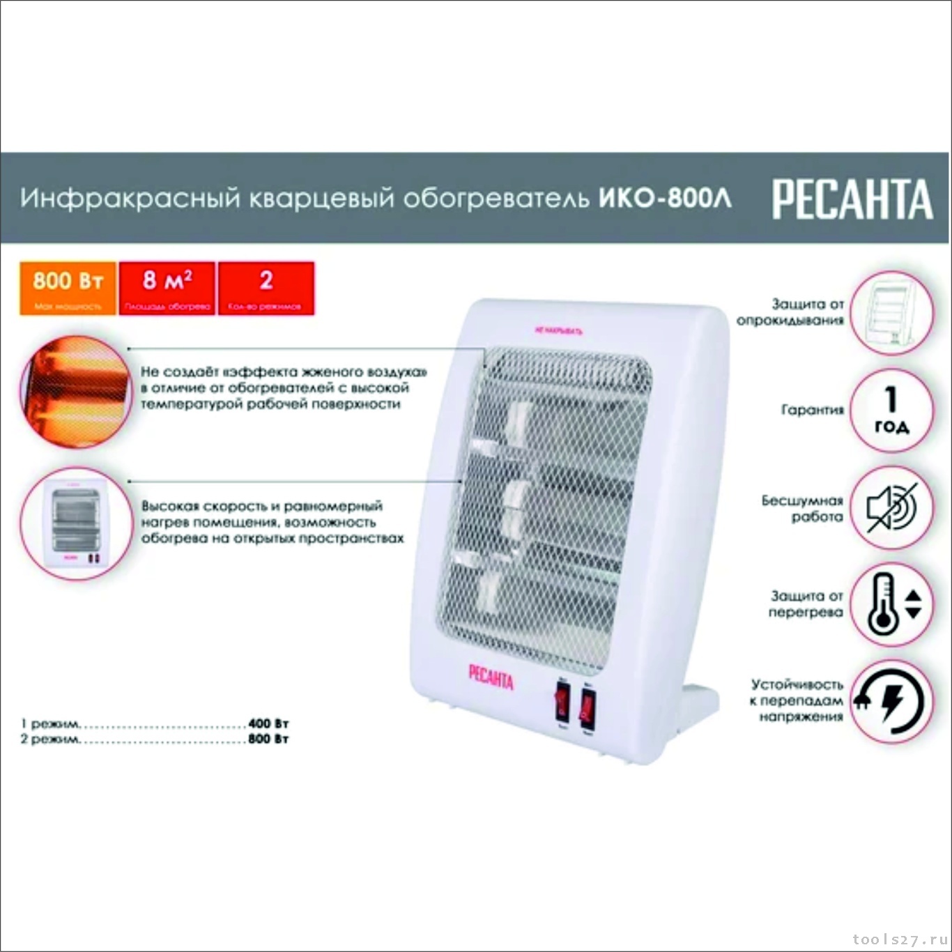 Инфракрасный ламповый (кварцевый) обогреватель Ресанта ИКО-800Л – компактная переносная модель мощностью 800 Вт для зонального или дополнительного обогрева промышленных и бытовых помещений. При отсутствии центрального отопления является оптимальным вариантом для небольших комнат площадью до 14 м².