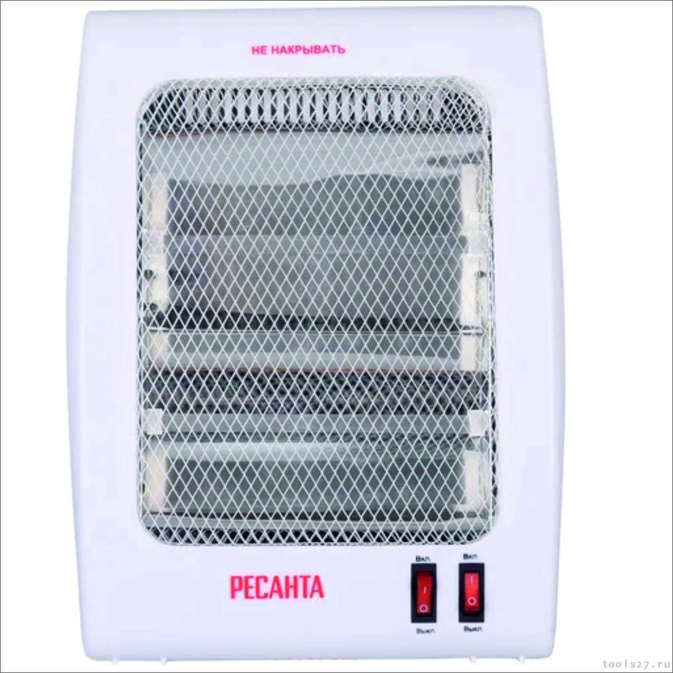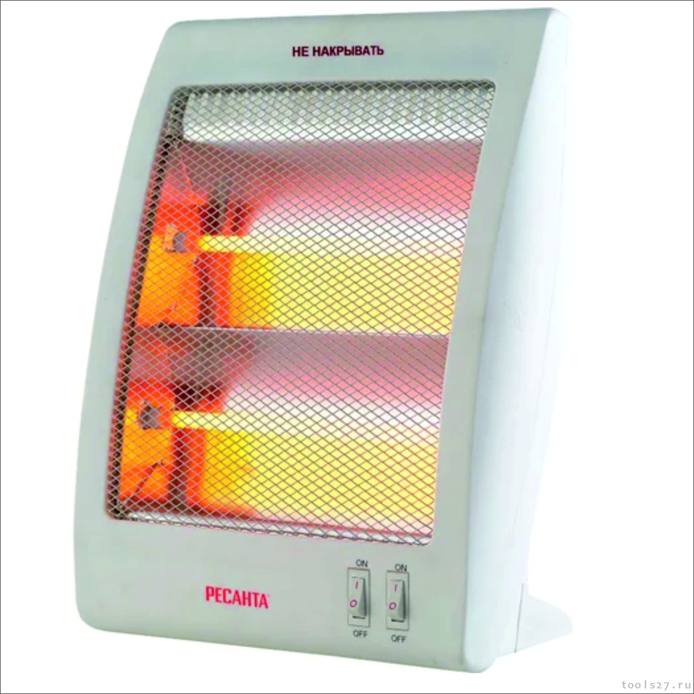 Обогреватель представляет собой пластиковый белый корпус, в котором в качестве нагревательных элементов установлены две кварцевые лампы. Каждая из них включается отдельной кнопкой на передней стороне корпуса, таким образом обогреватель работает в 2 режимах – 400 и 800 Вт. Для устойчивого положения на ровной поверхности модель снабжена съемными ножками-упорами. На задней части корпуса предусмотрена выемка для переноски прибора в руке.