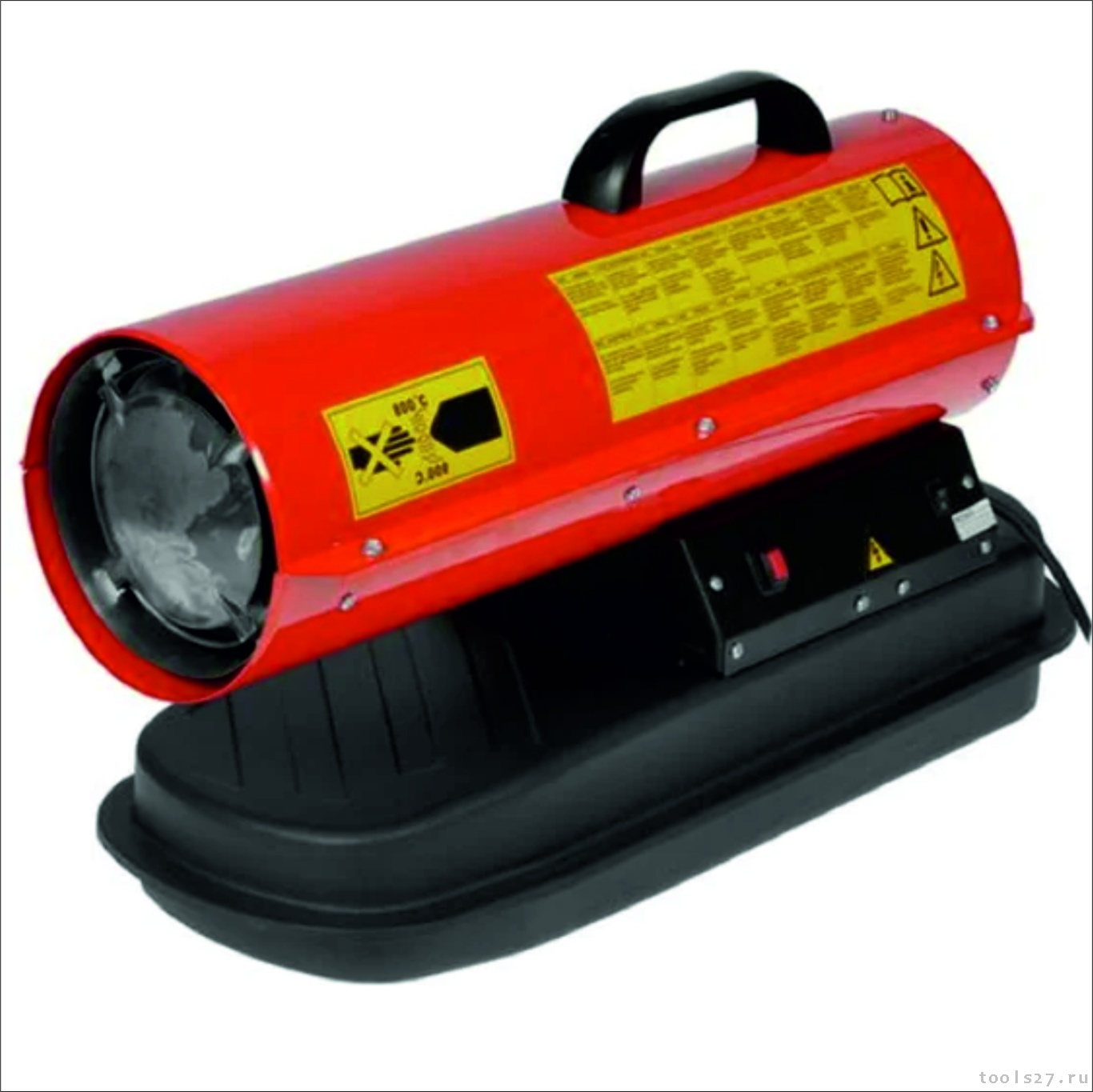 В бак объемом 12 л можно заливать дизтопливо или керосин. При максимальном расходе дизеля 0,83 кг/ч тепловая пушка выдает мощность 10 кВт. Режим работы, интенсивность нагрева и расход топлива регулируются механическим термостатом. Он автоматически поддерживает температуру окружающей среды на заданном уровне.