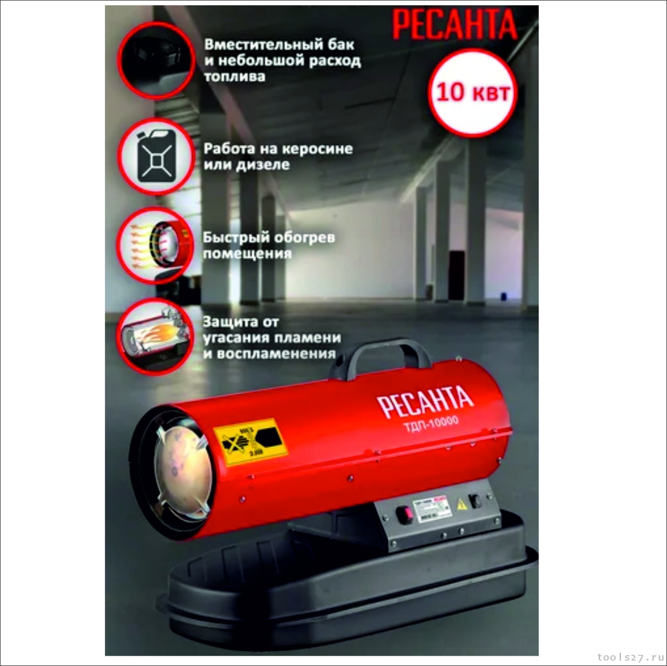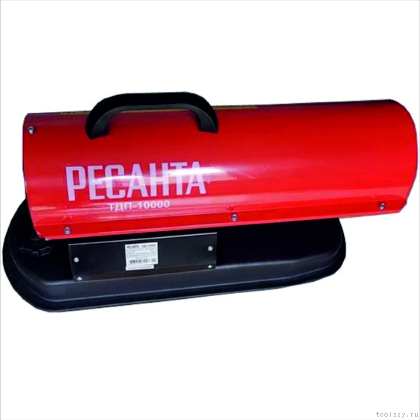 Ресанта ТДП-10000 относится к приборам с прямым типом нагрева. Промышленный вентилятор с производительностью 320 м³/час прогоняет воздух сквозь пламя горелки. Температура выходящего воздуха достигает 800 градусов. Продукты горения отводятся вместе с воздухом. Поэтому дизельные тепловые пушки рекомендовано использовать в нежилых помещениях с качественной вентиляцией.