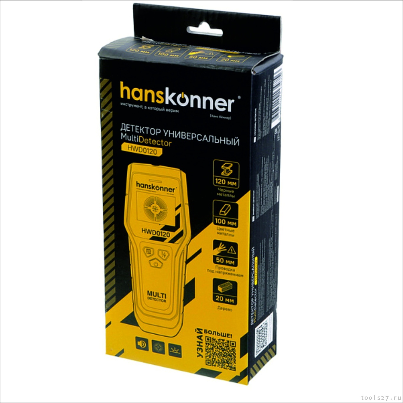 Детектор проводки, до 120мм, проводка-дерево-черные и цветные металлы, 9В, Hanskonner HWD0120 (2210)