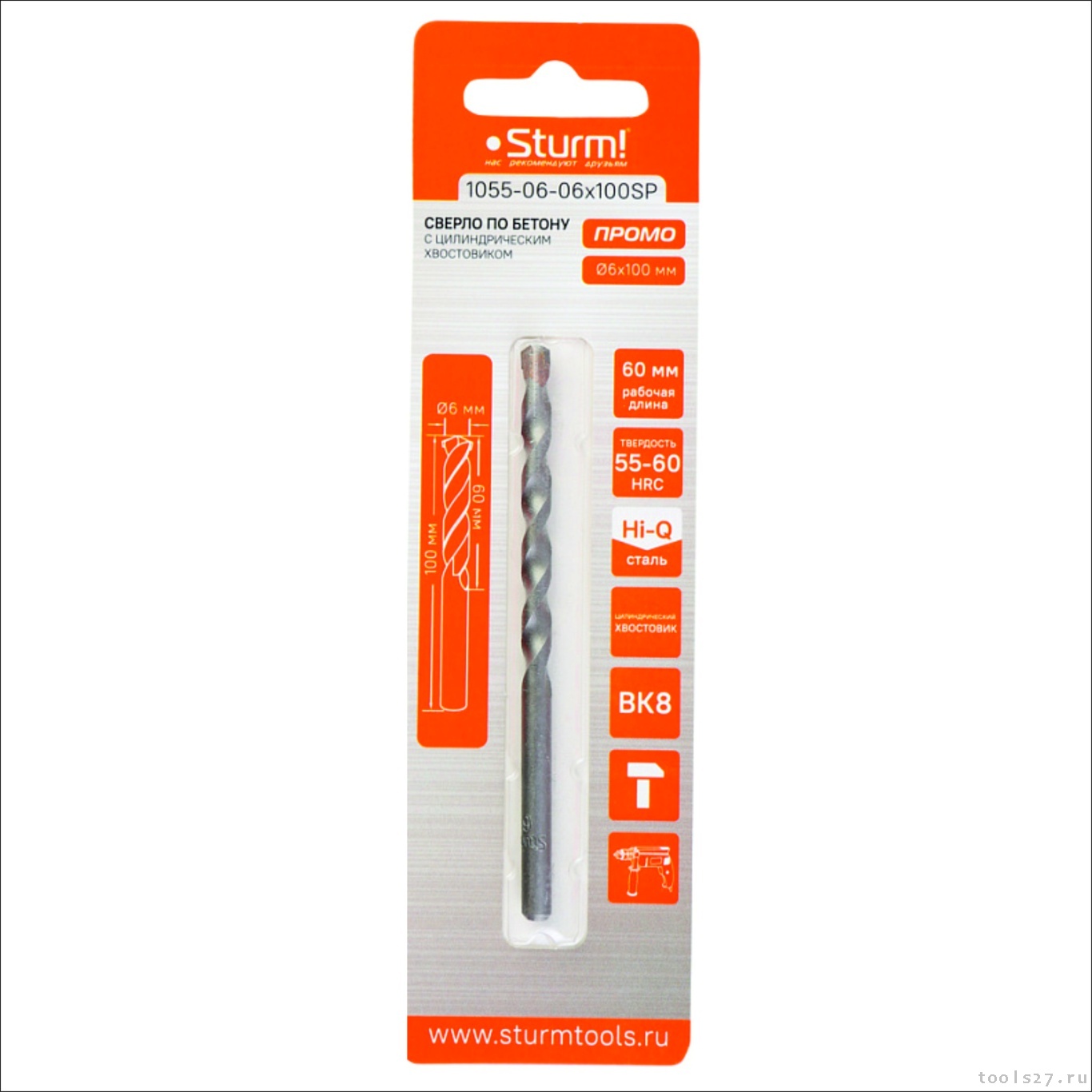 Сверло по бетону, 6x100мм, твердосплавная напайка BK8, цилиндрический хвостовик, Sturm! PROMO1055-06-06x100SP (2236)
